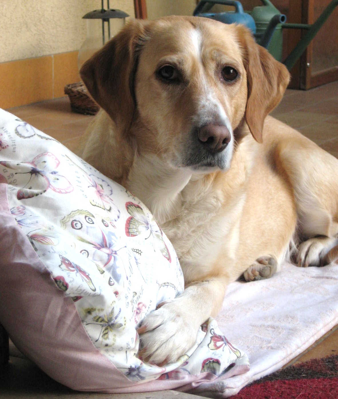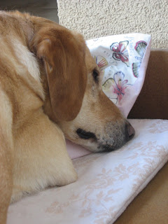 Oggi vorrei mostrarvi una creazione davvero ben riuscita, non tanto per il risultato finale....ma per la soddisfazione ricevuta!!! Si sa che per chi crea ricevere soddisfazione ripaga di tutta la fatica. A dire il vero questa volta non ho faticato moltissimo... ;) Avevo una vecchia tovaglia, dal tessuto rosato di cotone grosso, che giaceva tra altre stoffe in armadio. Domenica ho visto la mia Penny Lane in giardino in cerca di un giaciglio comodo.Considerando che l'adoro ma che è pur sempre un cane, che sbava, mordicchia e quant'altro, ho pensato che quella vecchia tovaglia poteva fare al caso suo, e così l'ho presa, piegata, ci ho infilato dentro l'imbottitura e l'ho cucita tutto intorno.Semplicissimo. Avrei voluto scriverci sopra dog magari con l'applique, ma visto l'uso e il fatto che volevo proprio completarla nell'immediato mi ha fatto cambiare idea.Ho accostato un vecchio cuscino con belle farfalle ma ormai sbiadite dal sole, per fare un romantico "pendant" (è pur sempre una femminuccia!) et voilà.....!