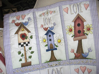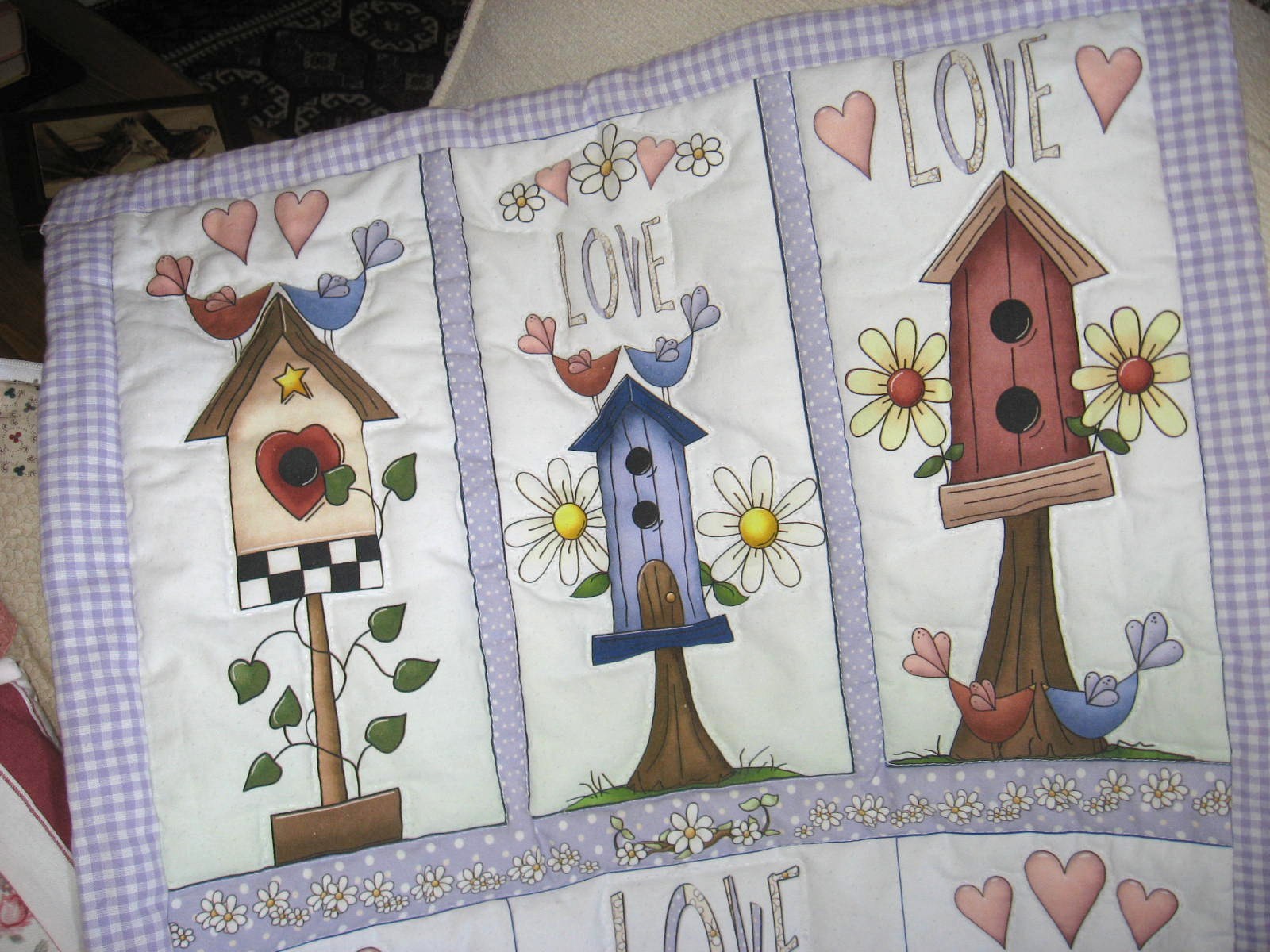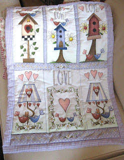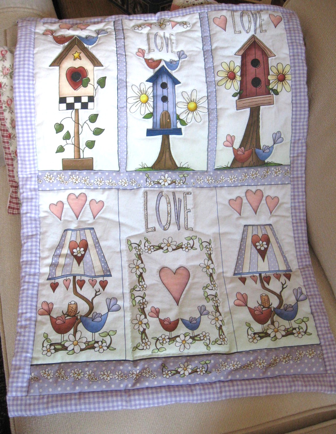 Di solito quando si tratta di baby, essendo le misure delle copertine piccoline e quindi umane nei tempi di lavorazione, mi diletto col patchwork. Pezzettini di stoffe di varie colori e perché no anche vecchi scampoli per creare strane geometrie e accostamenti di vario tipo.Questa volta invece ho preso direttamente un pannello pronto, acquistato via internet. Mi aveva colpito tantissimo questo tema del nido e degli uccellini che ho trovato davvero teneri senza essere leziosi....almeno secondo i miei gusti e così, ricama un po' qua, trapunta un po' là, ne è venuta fuori questa copertina color lavanda