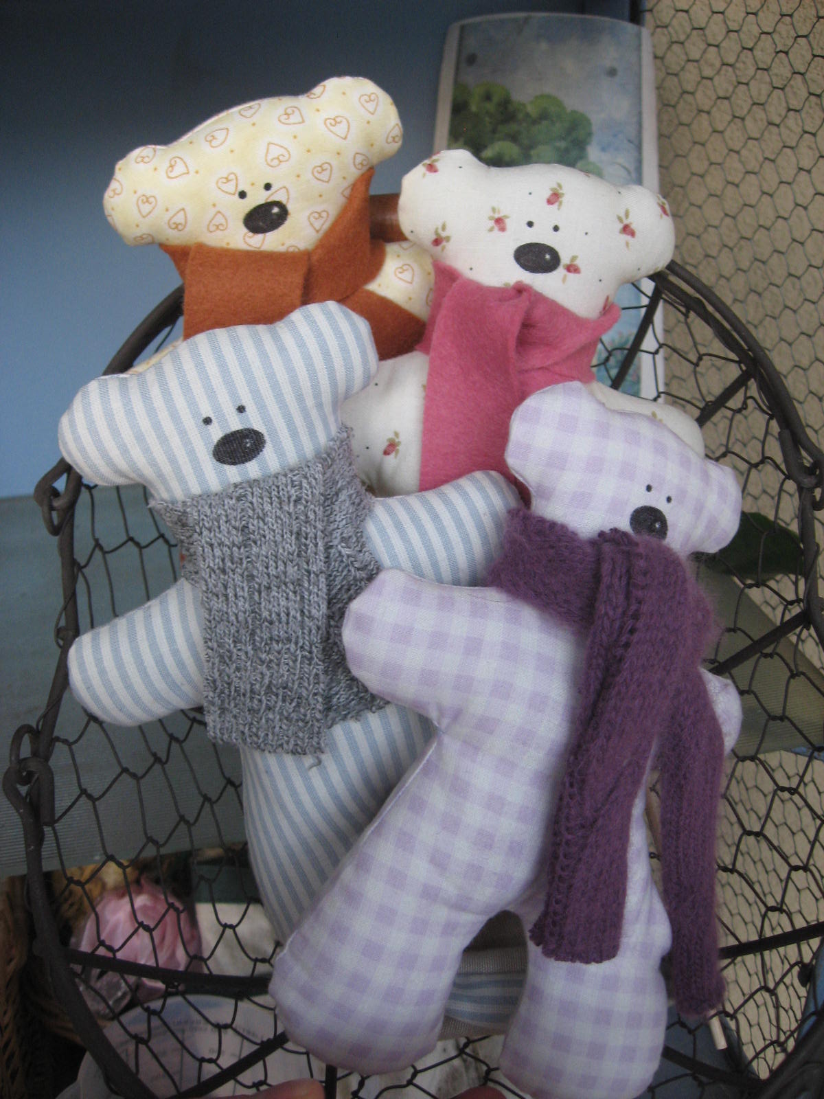 Quando li ho cuciti - e mi son spesa in duecento tentativi prima che venissero quantomeno decenti nelle proporzioni - l'ho fatto perché ispirata ed incantata dalla bravissima Chiara di My Country Nest.Seguo il suo blog ormai da anni, è a dir poco bravissima con ago e filo e le sue creazioni sono fonte d'ispirazione continua.Lei ha usato questi orsetti come bomboniere, se non vado errata, ma anche come decorazione dentro un quadretto, omaggio ad un nuovo arrivato! Io per ora li tengo tutti assieme, in questa cesta recuperata, non mi ricordo se in un supermercato o in qualche fiera di paese...:)
