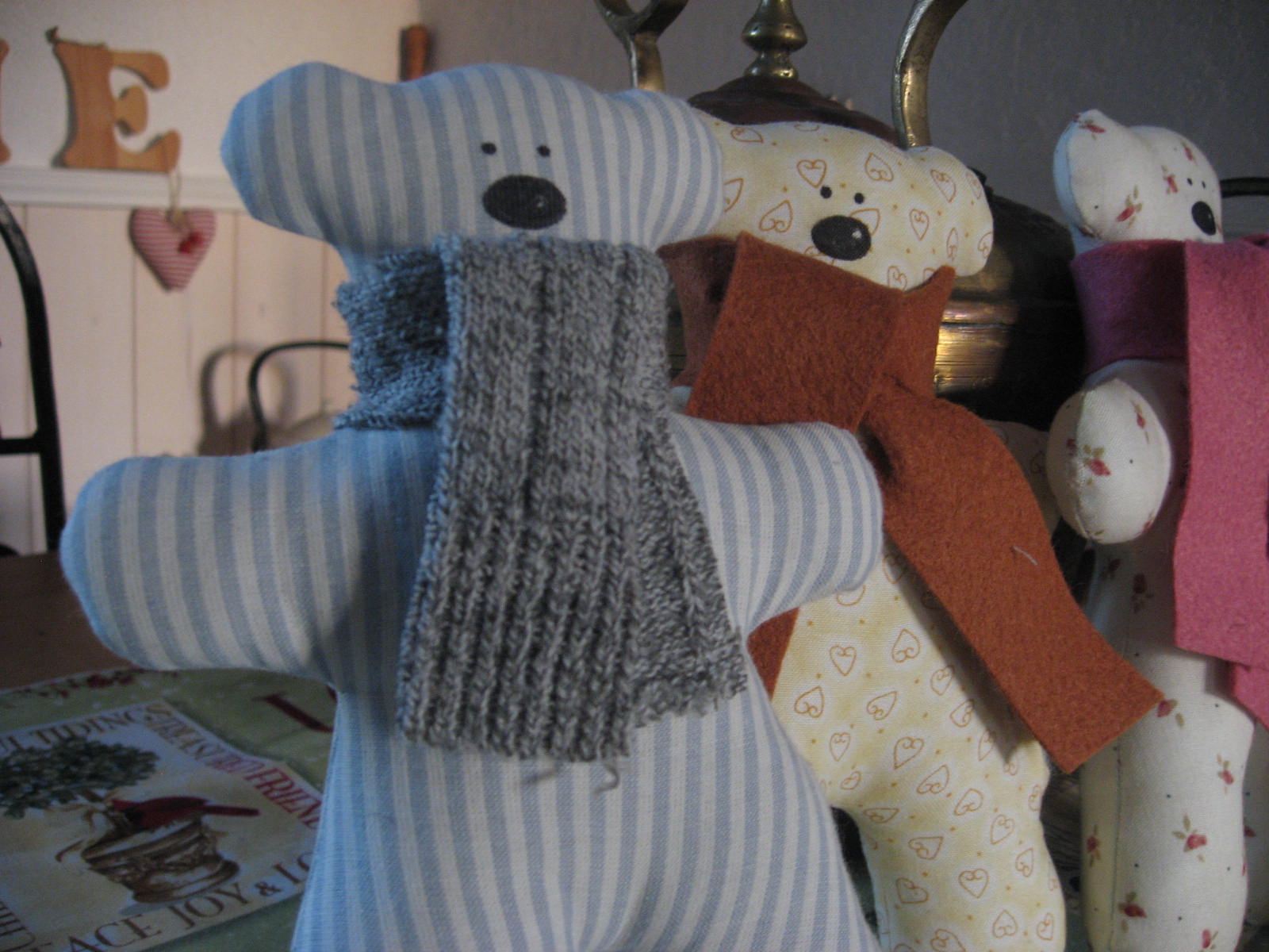 Vi chiederete: perché la sciarpa????Il fiocco attorno al collo non mi veniva nemmeno se lo pagavo perciò ho pensato bene di metter loro una sciarpa un po' di feltro, un po' di lana...in fondo anche se le giornate sembrano migliorare-che bello oggi è spuntato pure il sole!-con questa umidità meglio coprirsi per bene...ehehehhe :)