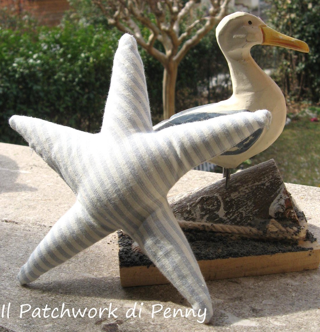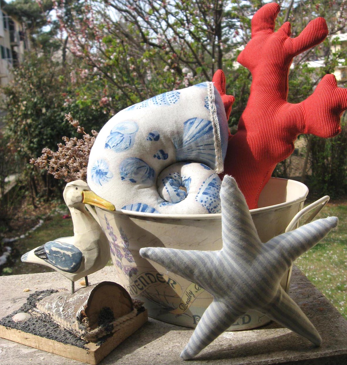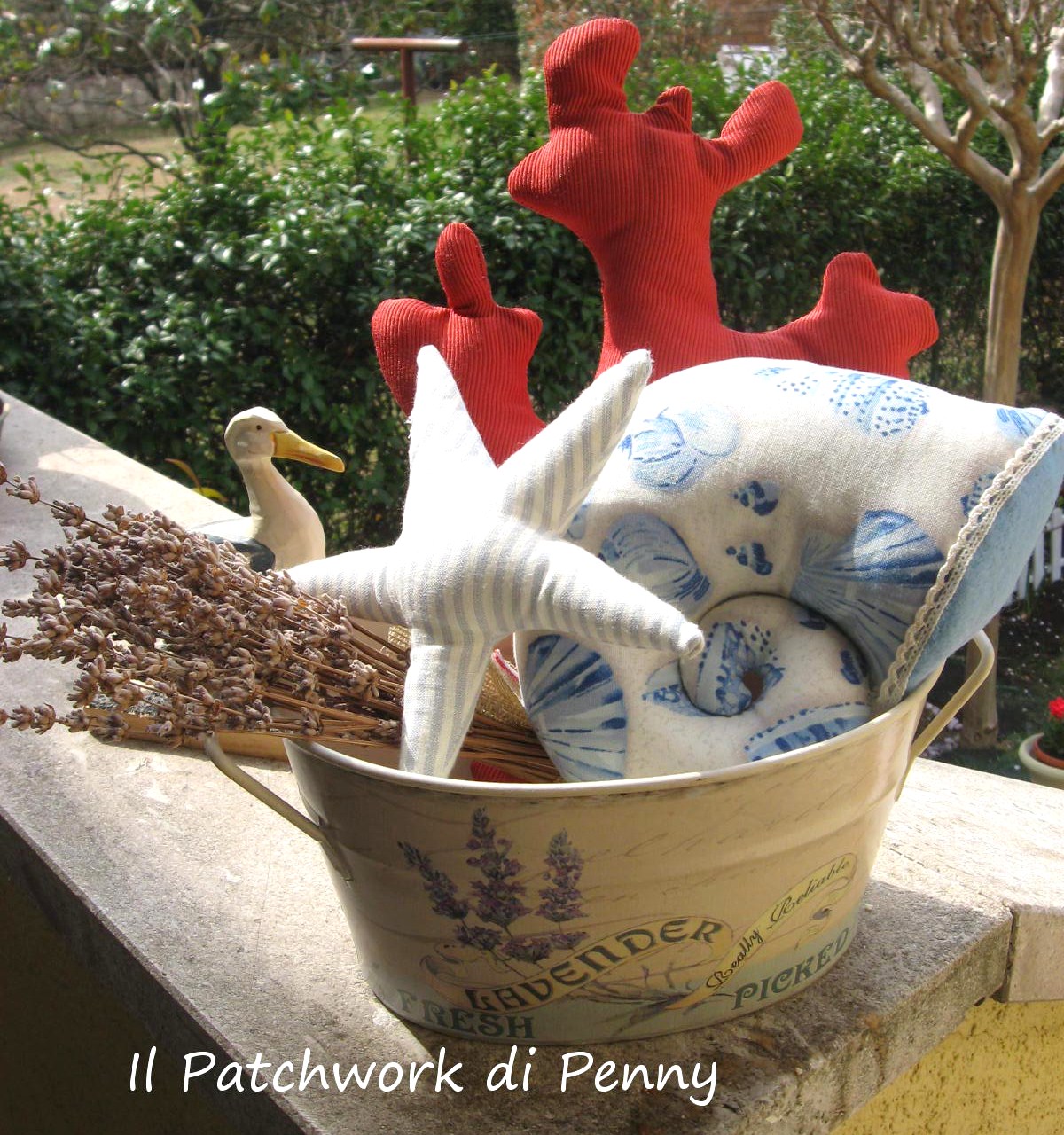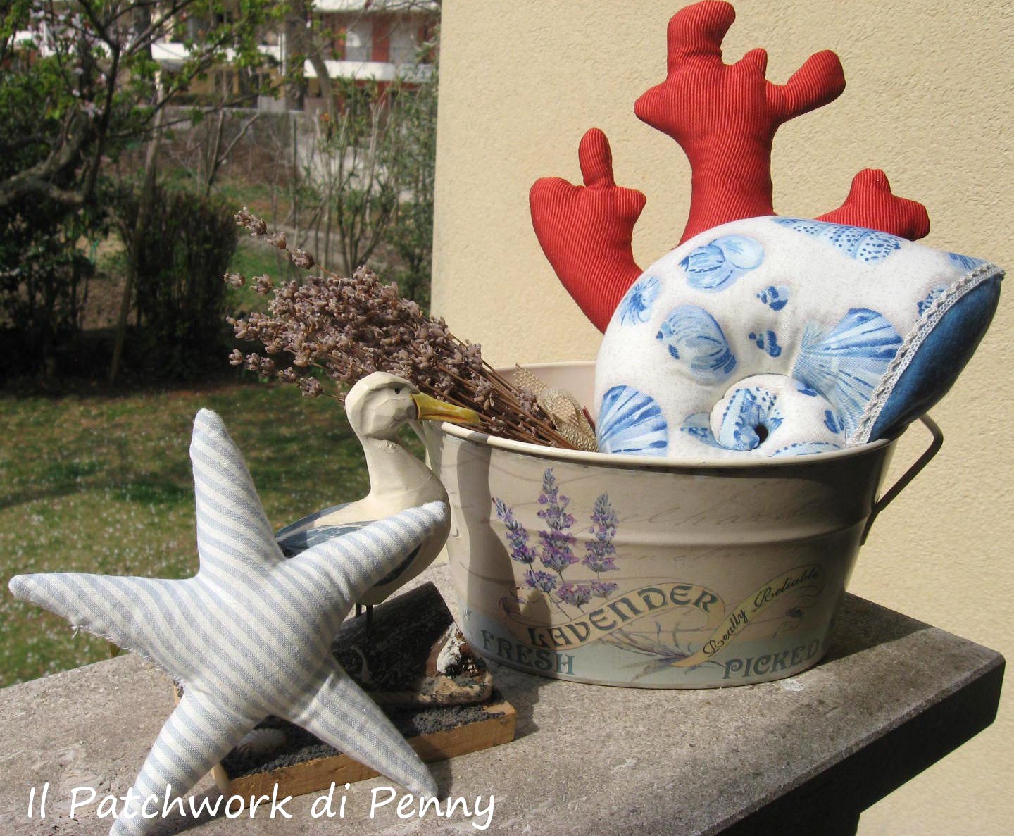 La altre creature marine invece sono entrambe prese dal libro "Idee in stoffa per la casa"di Tilda. La conchiglia l'ho un po' modificata, era la prima volta che la cucivo, perciò, essendo incredibilmente impaziente non avevo assolutamente fatto la base di stoffa prima di imbottirla. Mi sono ritrovata con la conchiglia imbottita e un enorme buco......Ops! :) così ho pensato di prendere del feltro che avanzava e guarda caso era dello stesso colore (ma che coincidenze nella vita!) e dopo averlo cucito, l'ho adornato con del pizzo bianco.Vi chiederete: perchè quel contenitore "lavander"? Perchè tutto è imbottito anche con la lavanda..mi piace il profumo e mi sembra di dare un senso più pratico alle creazioni di stoffa! :)