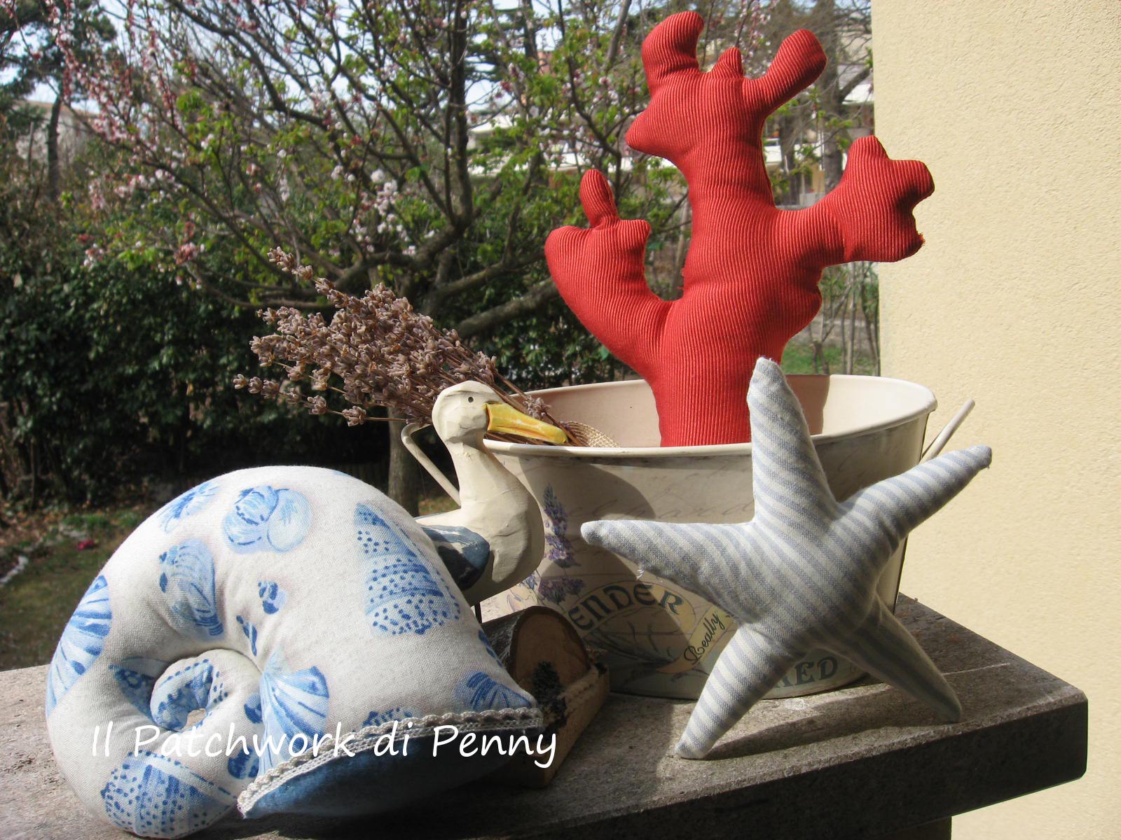 Sarà la temperatura così mite, sarà che per l'appunto questa primavera somiglia sempre più ad un'estate ma invece di sentirmi pronta per la Pasqua in arrivo e quindi preparare ovetti, coniglietti, colombe e quant'altro mi sento molto più "marina" del solito! E infatti oggi, complice una nuova stoffa color corallo, mi sono cimentata in una creazione tipicamente marina....un corallo....una conchiglia e una stellina! C'è anche un gabbiano di legno che ho comprato qualche tempo fa... chissà dove! :)