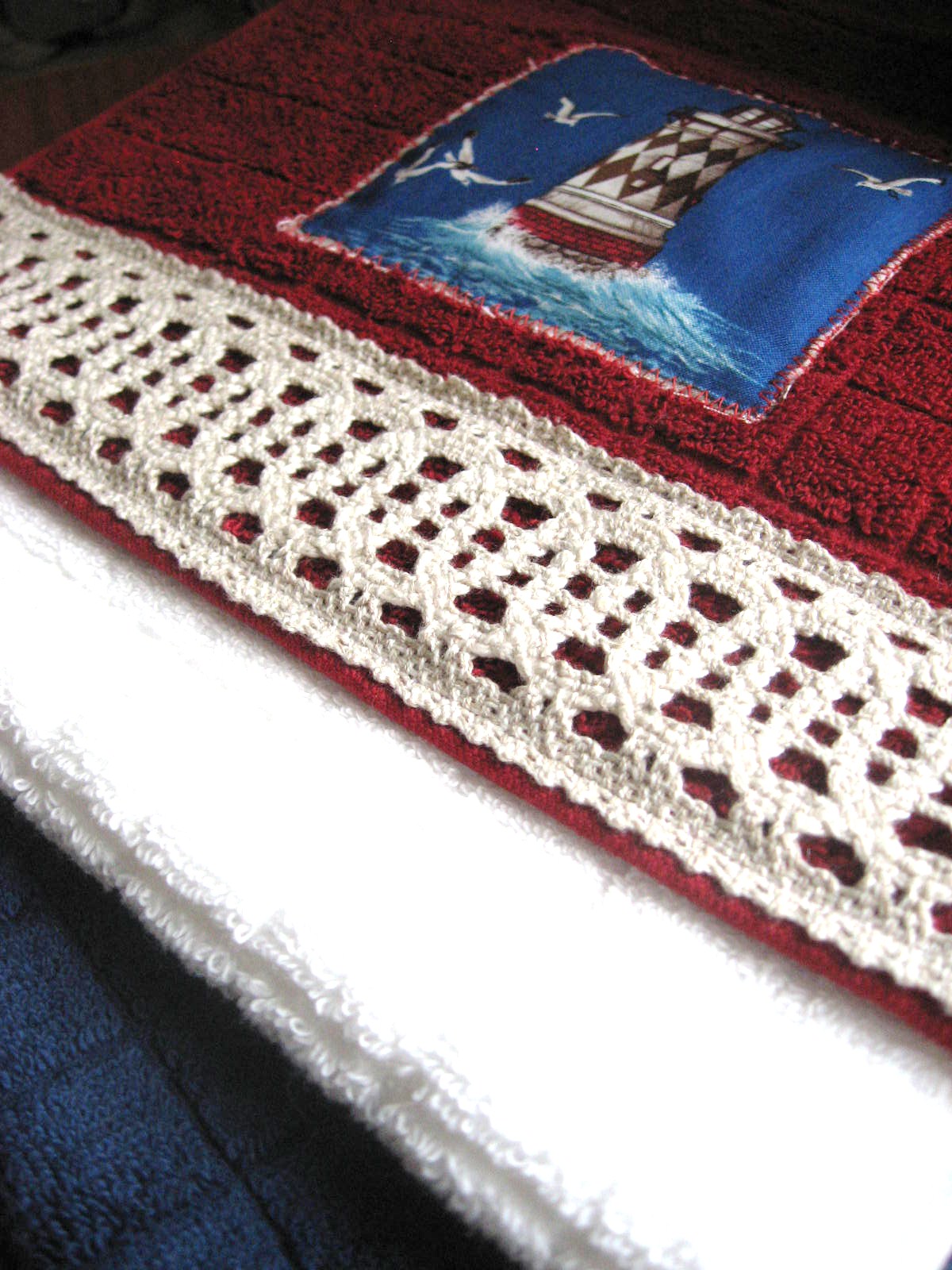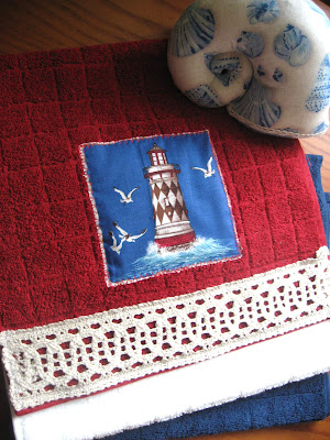 Quanto tempo è trascorso, povero il mio blog! Quante cose da fare! sono state giornate davvero molto impegnative anche se, non so come, sono riuscita a terminare un sacco di lavori che avevo in sospeso.Ve li mostrerò con calma perché proprio ieri ho finito una trapuntina per una piccola amica, solo che furbamente ho dimenticato di fare le foto! Ma niente paura mi arriveranno prima o poi e le potrò pubblicare. Ma tutto ciò a tempo debito, ora vorrei farvi vedere i miei amati asciugamanini cui ho deciso di applicare degli scampoli di una stoffa a tema marino.Che me ne faccio? Mi son detta quando avevo terminato di cucire delle tovagliette all'americana...e così vista la geometria semplice(sono tutti quadrati) e i colori, ho preso dei teli dalle tonalità blu, bianco e rosso (incredibile!) e li ho applicati.Li avevo già fatti per il mercatino di Duino e ho notato che hanno avuto più successo di quelli coi cuoricini.Così li ho replicati, cambiando un po' i colori.Questo è il primo e l'ho affiancato alla conchiglia alla lavanda che avete già visto qui....non è carino?