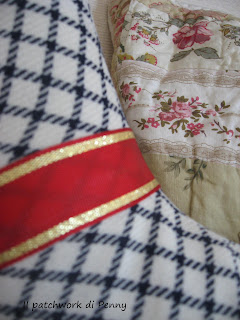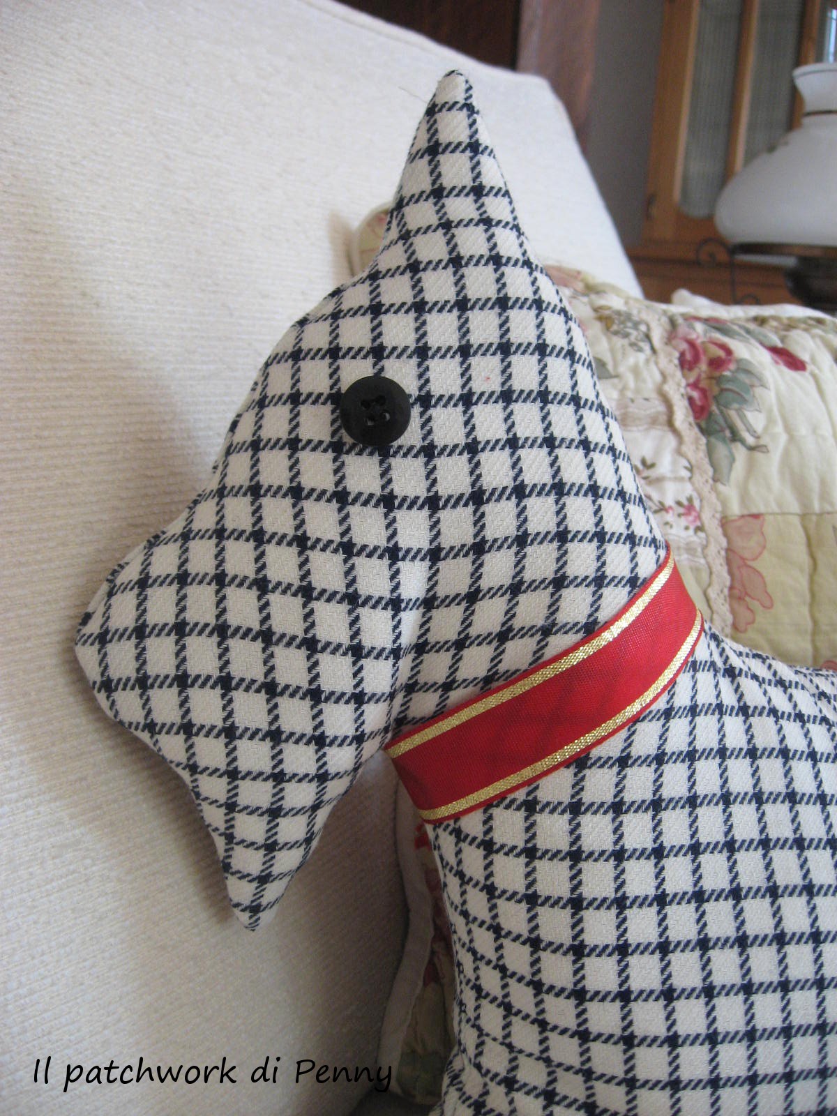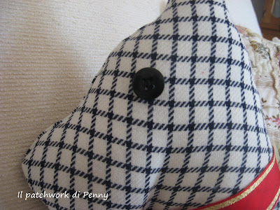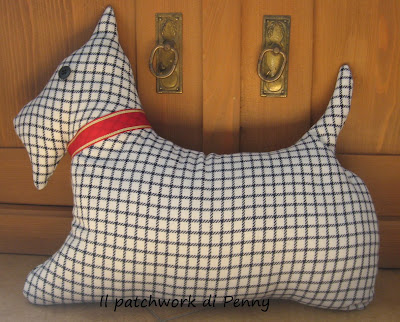 Per esser il primo che faccio ne sono proprio soddisfatta!!! Ha un nastrino rosso che mi avanzava da Natale...un vecchio bottone per occhio e sì, gli manca il naso, è vero...e bhè....e bon....magari è un vecchio terrier che ha dato la vita a cacciar lepri nelle tane e ora si gode un meritato riposo sul divano(se guardate bene ha anche un po' di pancetta )!!!