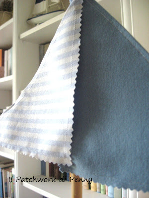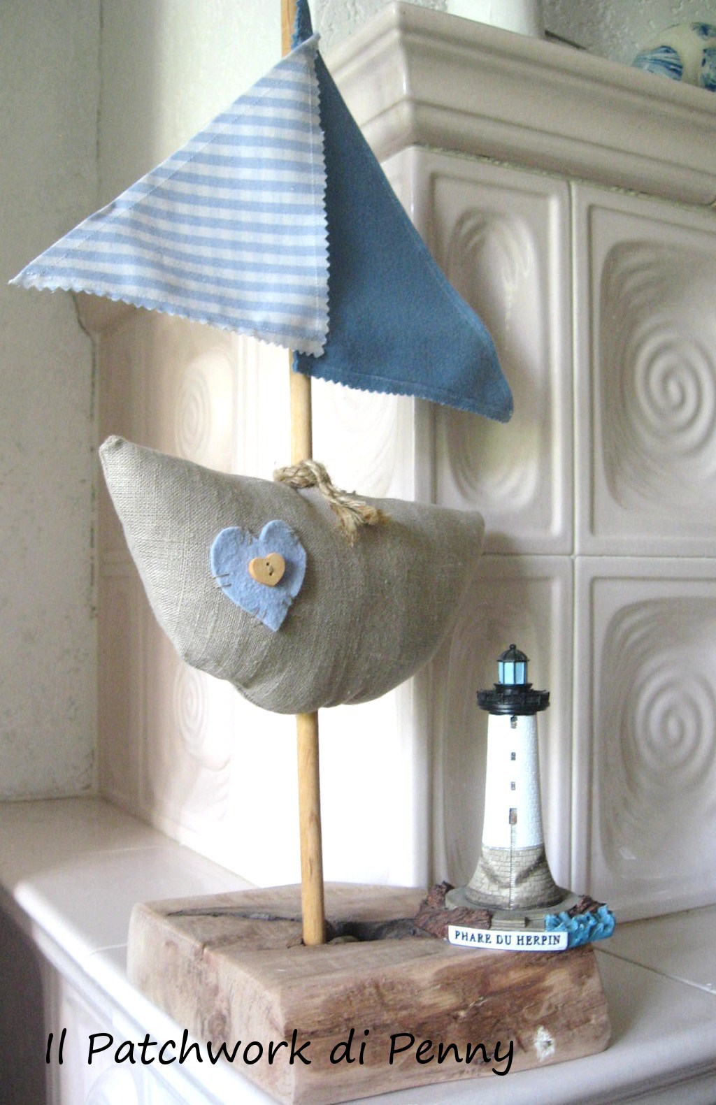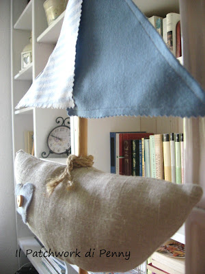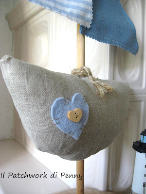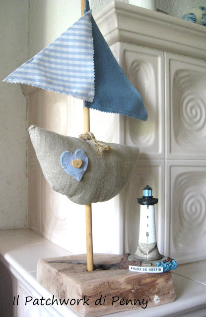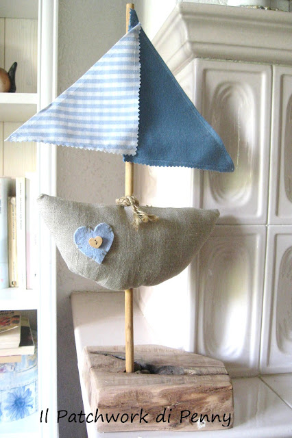 Pronti per le vacanze? Io sìiiii!!! :) Scusate se scrivo un po' a spizzico magnifico in questi giorni, ma sapete com'è con tutte questo bel caldo e questo bel sole è proprio dura lasciare pinne, fucile ed occhiali ed inforcare un ago!Figurarsi accender un pc!!! :) ehhehe, l'estate mi piace un sacco perché la sera c' è tanta luce e si può indugiare (quel mezzo secondo contato ma è già qualcosa) in ozio nella nuova terrazza e nel fresco giardino.Cucio molto poco ultimamente perché mi sento bovinamente e mentalmente in ferie ..che splendida sensazione...:) oggi vi presento una barchetta che avevo preparato per il mercatino a Marano Lagunare in Giugno.Non me ne sono nemmeno accorta ma, una volta terminata, il risultato, ben lungi dall'originale sia chiaro, mi ha ricordato tantissimo lo stile di Chiara di My Country Nest.