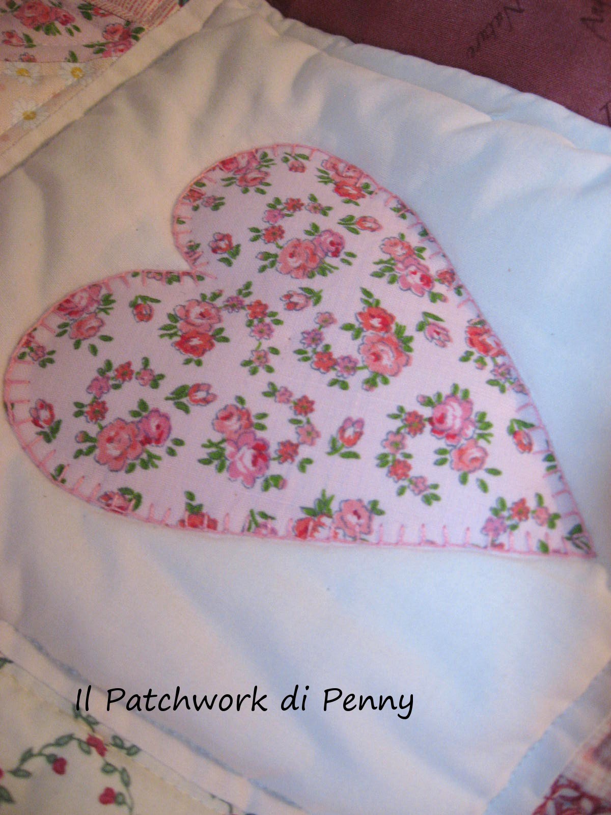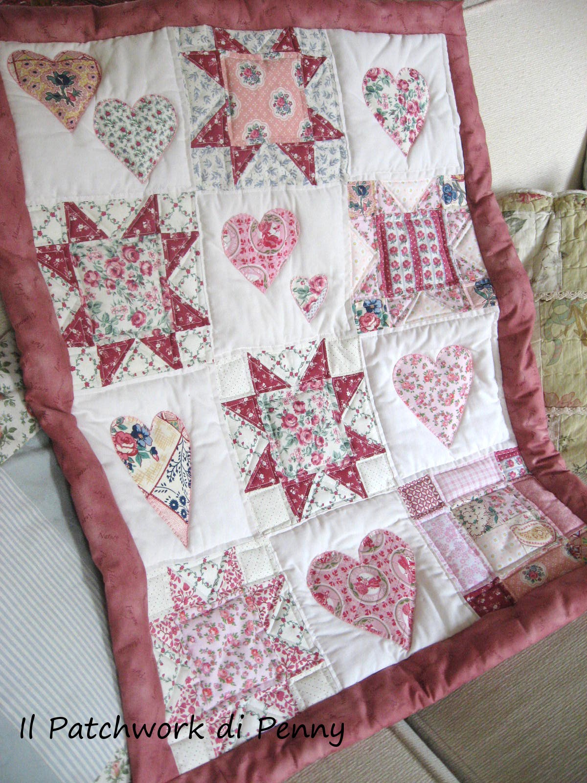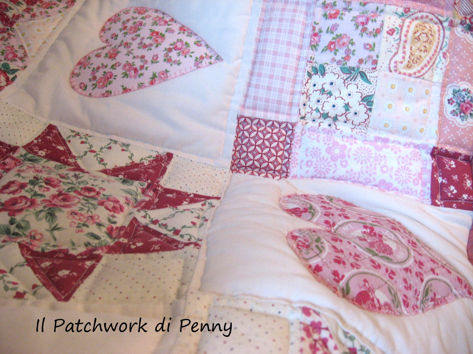 A little bit tired of all the sea stuff i showed you last times, today i post this lovely quilt.It's a little one, for a little girl, made of real patchwork.Do you know? Sewing near a candel light, with a white bonnet ..i'm joking! ;) This is a real patchwork because is made of old fornitures and stuff.Many years ago i put them aside, i shelved them, patchwork for me was a mission impossible! then i 've visited beautiful countries, america, great britain, ireland, and i understood i could do it,only if i could find enough patience :) .I've made this quilt, hand quilting all the hearts.It's not a lot, but for a woman who works is not so easy, you know.Is not perfect, perhaps without an exact pattern,but i don't mind :)It is so romantic to me because i've made it with all my heart, for a special person, and i can see her sleeping under this quilt..so sweet.And so here are the pictures, sorry i took a lot, too much? Forgive me, i'm so proud of it! :)