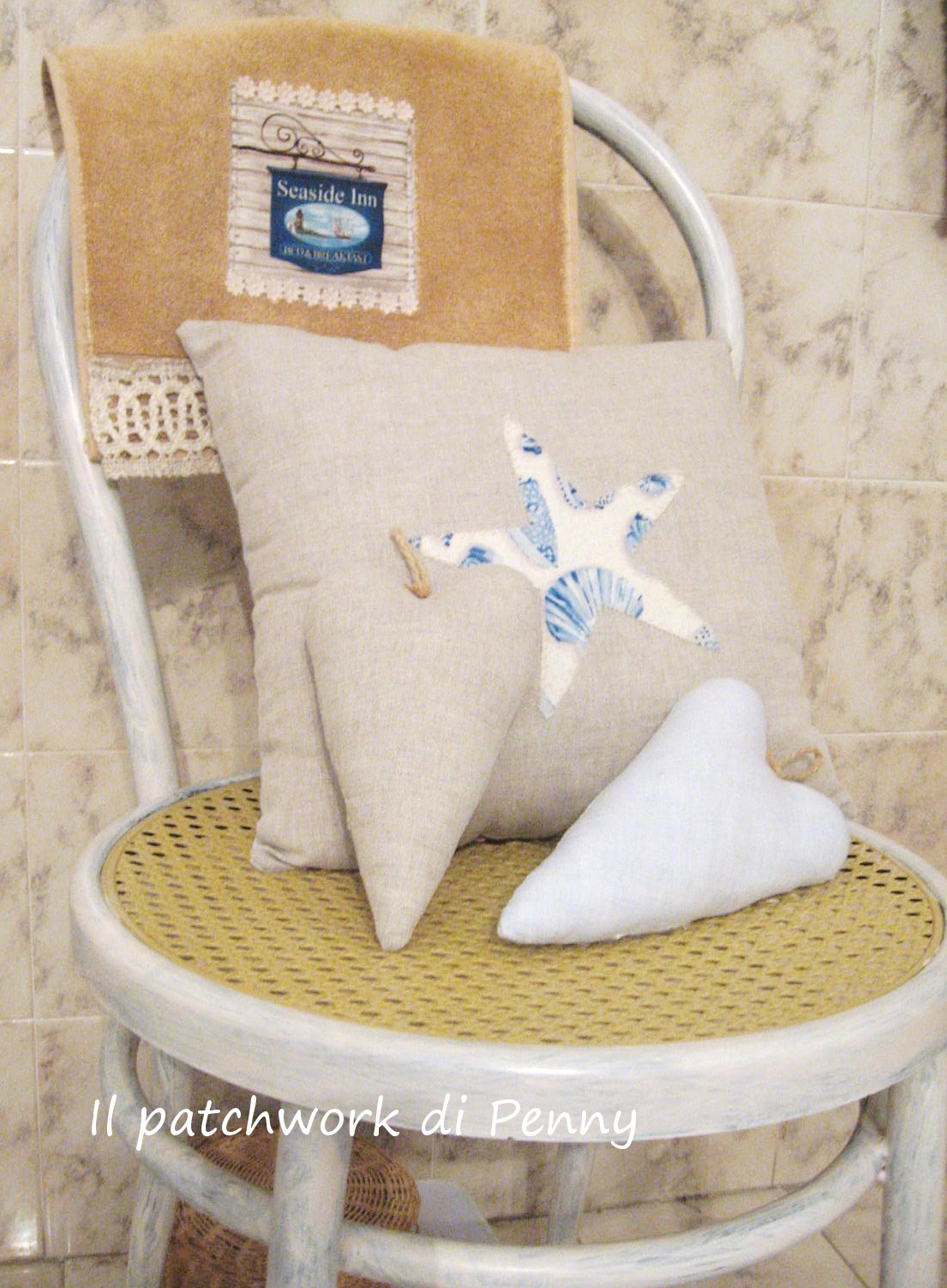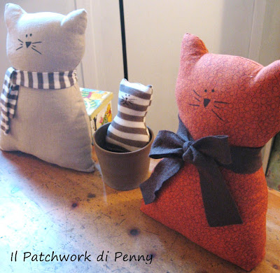 Ve li avevo preannunciati ed eccoli immortalati sul tavolo da lavoro della craft room, prima di acciambellarsi serafici sul vecchio sofà.Ne sono proprio fiera perché il disegno/cartamodello l'ho fatto io ed è stata la prima volta che m'è venuto pure decente!;).Qui ne vedete i primi due, poi ne ho cucito altrettanti sulle tonalità del bianco, del grigio e dell'azzurro, ma non sono riuscita a fotografarli perché sono stati subito adottati ieri al mercatino di Mirabilis :)