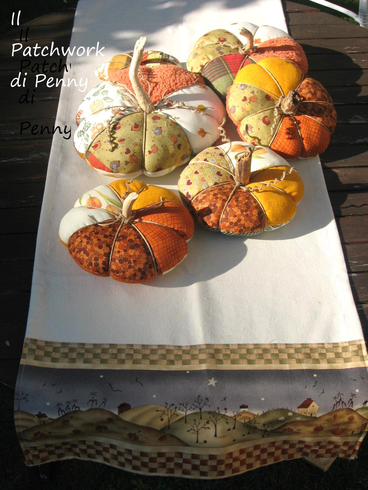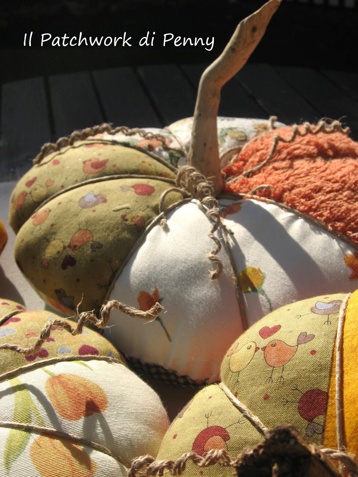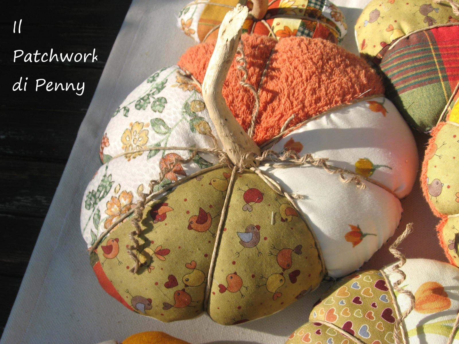 Le ho fatte ispirandomi a queste istruzioni qui, ma navigando sul web le potete trovare fatte in mille modi diversi, tutti originali e bellissimi. Sulle foto le vedete appoggiate ad un runner che avevo cucito lo scorso autunno e che si sposa proprio bene con le mie zucchette.Nascono da scampoli sui colori dell’arancio, del verde e del giallo. Dopo averle riempite di imbottitura, ci ho passato dello spago per fare l’effetto spicchi e ci ho incollato sopra un legnetto che avevo raccolto ancora tanti estati fa. Avreste dovuto vedermi mentre raccoglievo legnetti senza ancora sospettare di fare il blog, i mercatini e tutto il resto:mi dicevo, perché li raccolgo poi..eppure era più forte di me e il fatto che io li abbia usati in questa occasione mi ha fatto proprio sorridere!!!