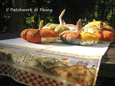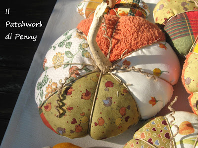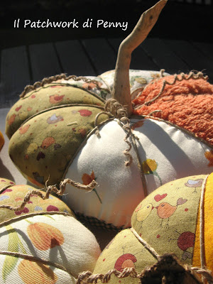Here they are, finally.If the weather will be fine- and i wish so because of all the organization, the enthusiasm, the hand made ..already done ;)-you’ll see them at san canzian d’isonzo (Go) by Mirabilis. Will you come to visit my stand, won’t you?;) I made them after surfing the net, i found them at this link.But you can make them as you prefer, the web is really full of tutoring and advices of so many pumpkins…you can find the best for you. These are made of rewired fabrics, orange, yellow and green, full of wadding.Then I used some strings, to do slices and fixed on the top a old little wood I kept so may years ago.Funny how the things change! Many years ago i did not plan to do any hand made or patchwork, and now these little pieces of wood were to me so useful! And now the foto gallery, yes i know i have taken too much photos, but anyway, that's it! :)