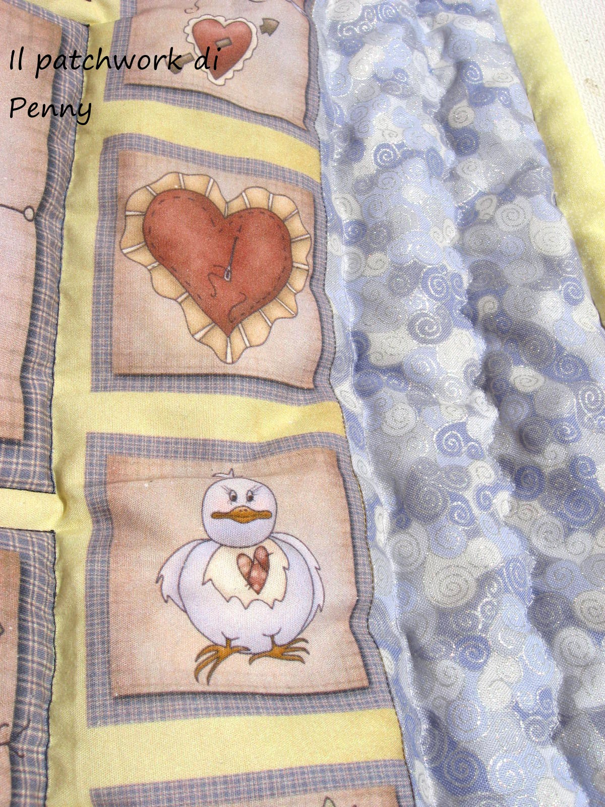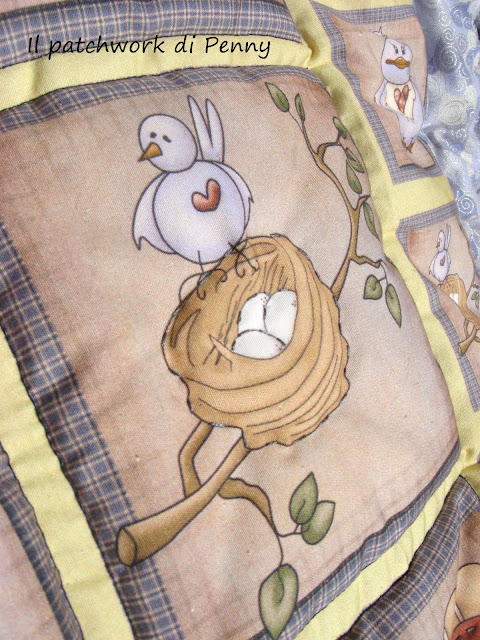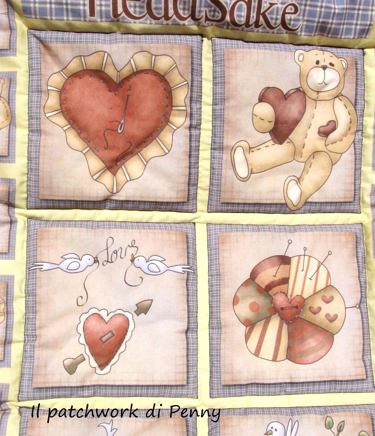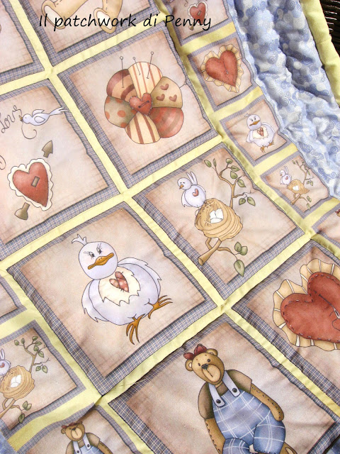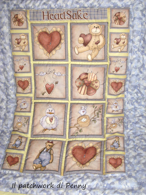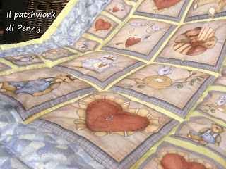 Anyway, parlando di trapuntine, oggi vi lascio con una copertina cucita qualche mese fa per una giovanissima e dolcissima mamma, che voleva fare un regalino al suo splendido maschietto in arrivo...Heart Sake della collezione I Coordinabili, pannello di cotone che ho ordinato in internet, a cui ho aggiunto una cornice azzurro e una cornice gialla.Trapuntato anche a mano, con tanto tanto amore augurando al piccolino una vita piena di coccole!