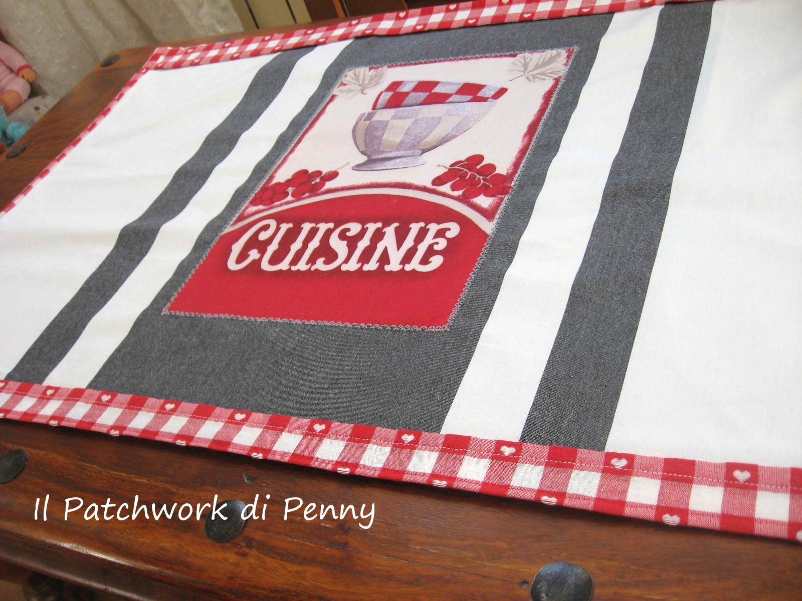 Il contrasto tra lo scampolo ikea grigio e bianco(sempre quello!) e il rosso del tessuto crea un effetto vivace e quella scritta "Cuisine" trovo che dia un delicatissimo tocco retrò e molto.....francese!