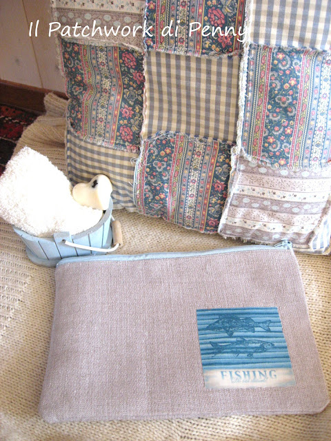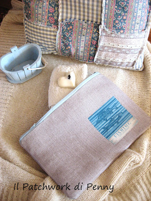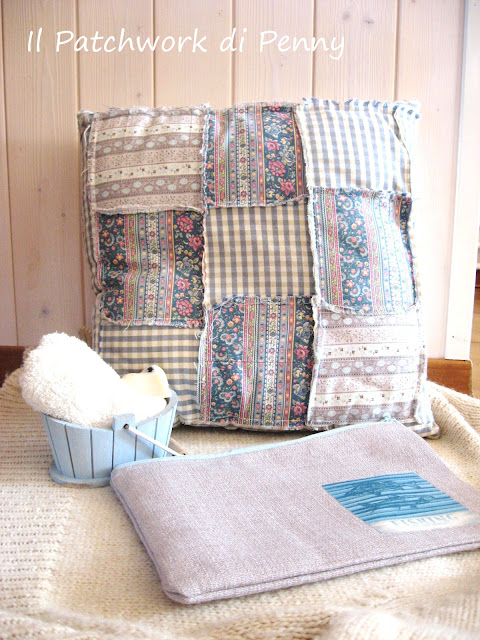 Eccola fotografata assieme al mio amato cuscino patchwork"alla rovescia"(i quadrati sono cuciti rovescio su rovescio, effetto molto shabby!), alla tinozzina in legno presa in un negozio di hobbistica e dipinta di azzurro per l'occasione e una saponetta alla lavanda (vedete quella macchiolina scura? giuro che è un fiore di lavanda!)che avevo preparato anni fa.