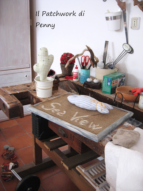 L'ha pitturata di azzurro (lui, che ha scoperto così lo stile shabby..;)...) e io ci ho incollato sopra un po' di juta e ...il pesce.