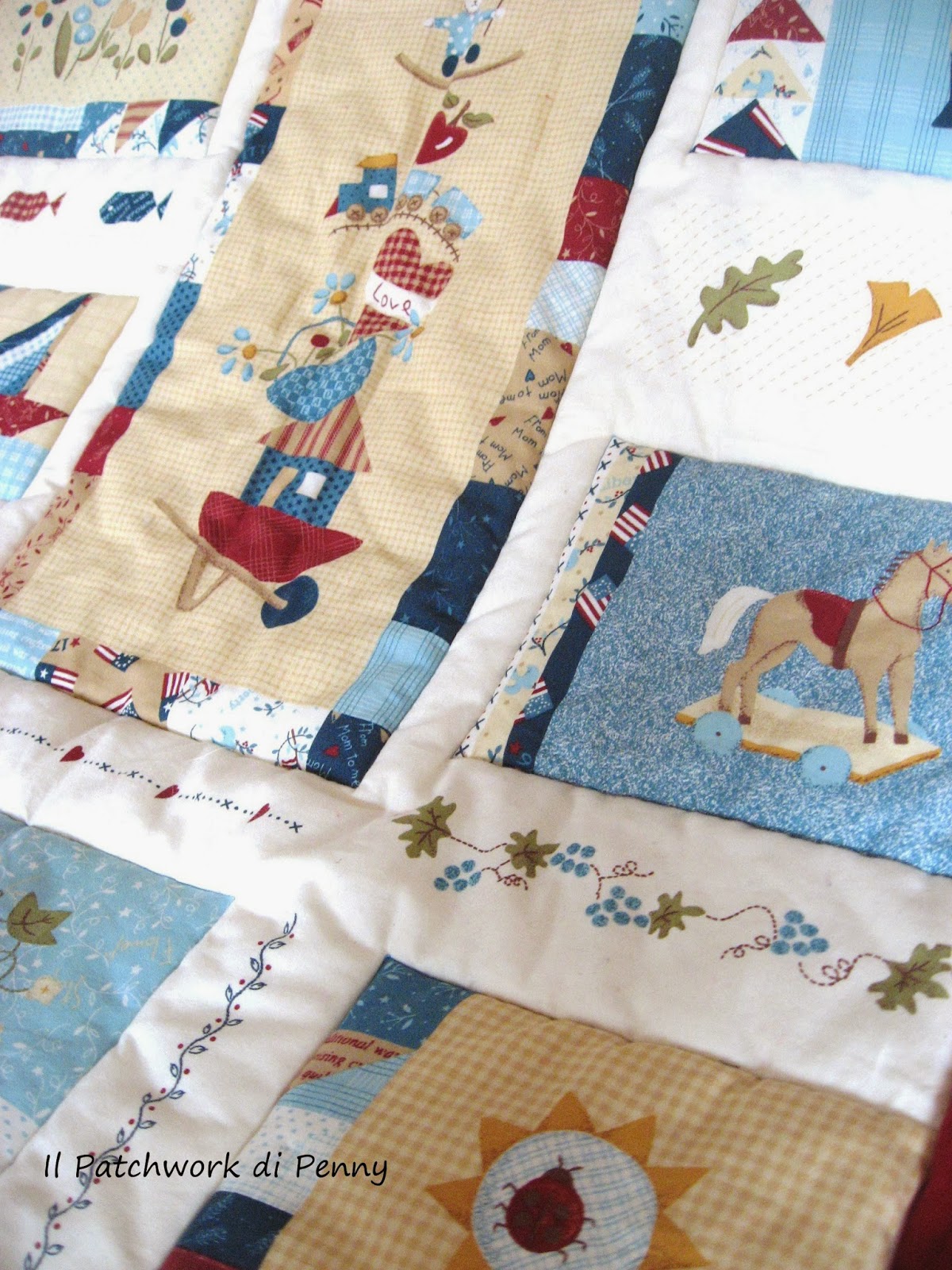 In realtà la copertina l'ho terminata di lì a breve, si tratta semplicemente di un pannello con le immagini già pronte, che io trapunto e a cui cucio a mano una cornice(non ho creato io i blocchi patchwork ex-novo per capirci).