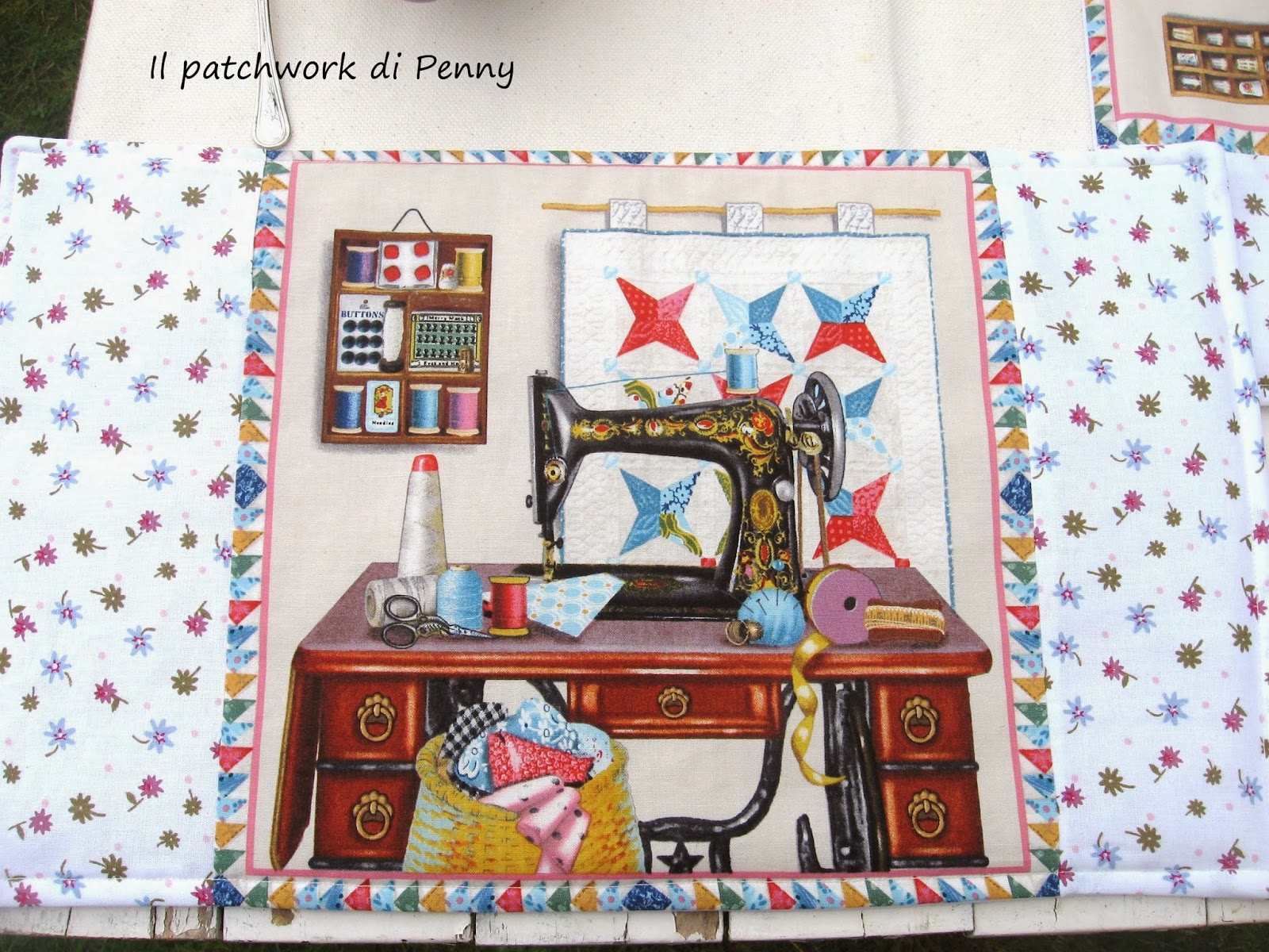 Cosa credete sia successo nel frattempo? Il sole mi ha fatto un bello scherzetto, mentre caricavo le batterie alla macchina il cielo si è ricoperto in un attimo di nubi grigie...spero che le foto rendano comunque! Si tratta di una stoffa comprata in America, una serie di quadrati raffiguranti macchine da cucire vintage.