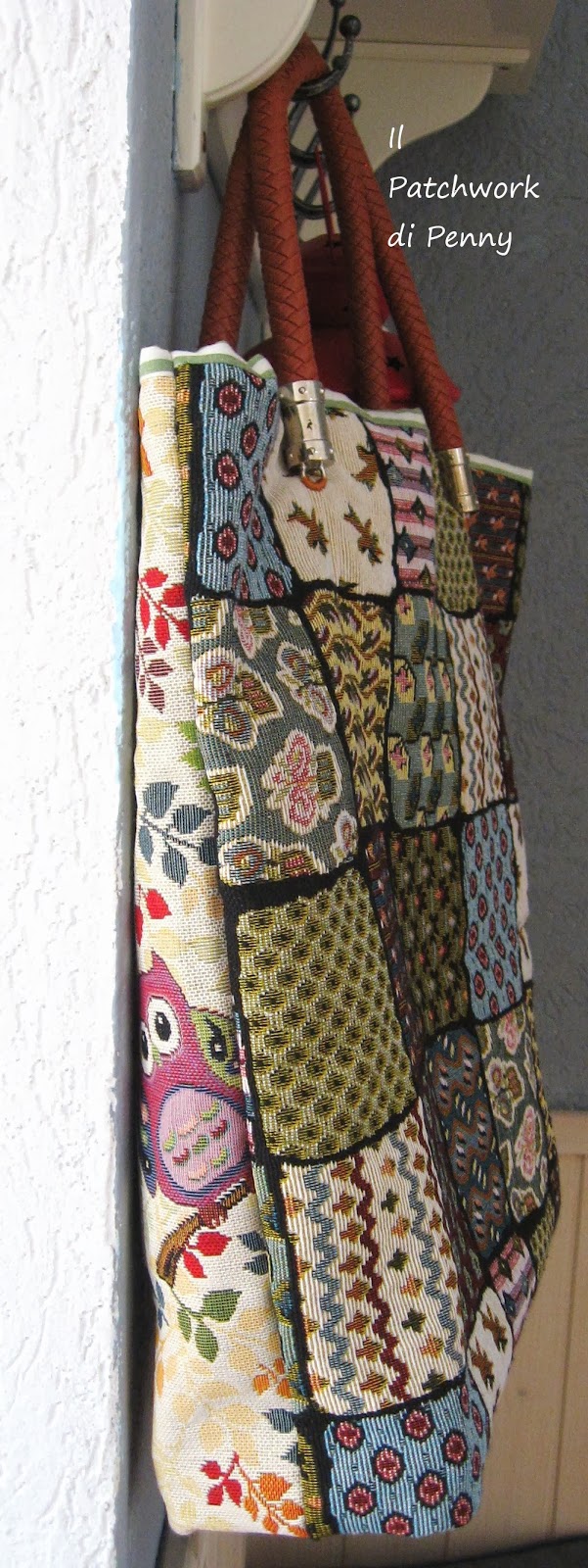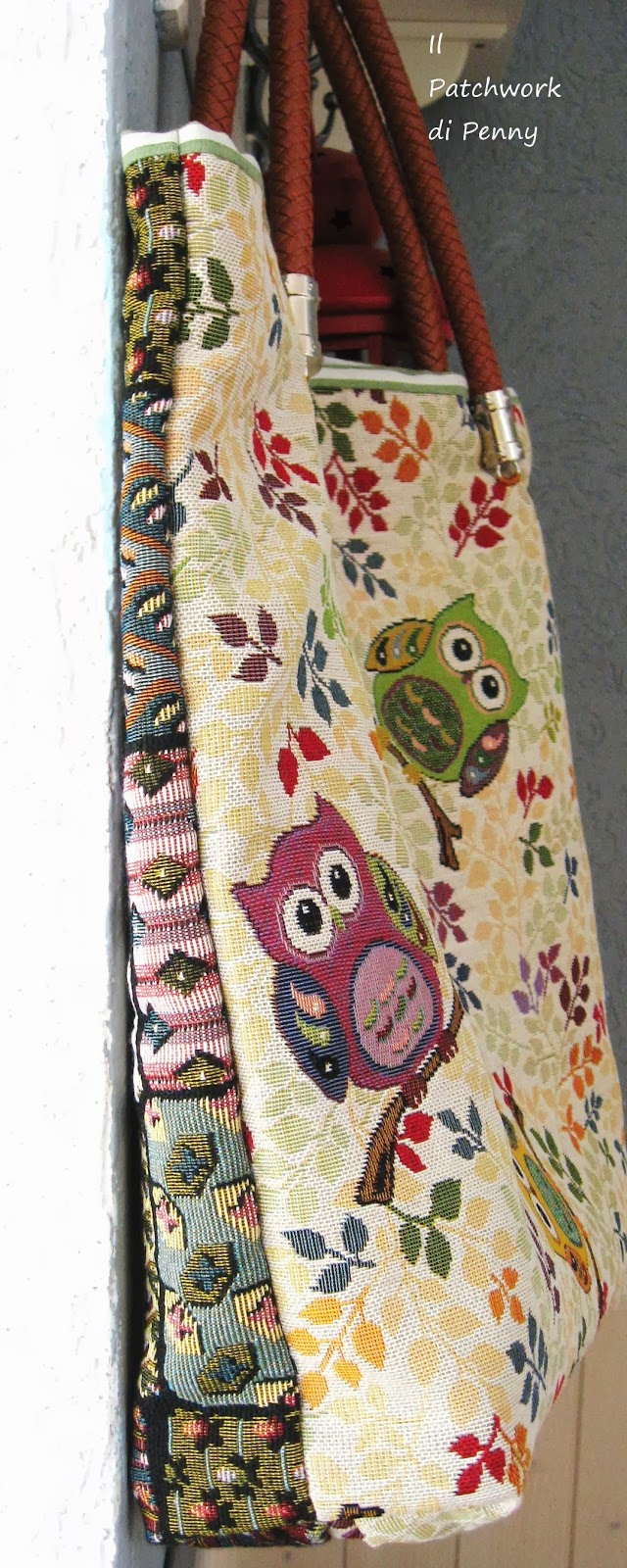 Con uno scampolo di stoffa per gufetti ho ricreato una borsa che avevo fatto quest'estate.Sul retro ho aggiunto altro tessuto coordinato molto resistente.La borsetta è diversa dall'altra, perché stavolta le ho dato una forma un po' più capiente e con maggior profondità.Ho cucito un fondo rigido, ci ho messo la tasca interna e poi ho cucito a mano due manici che ho comprato alla fiera di Vicenza.Come li ho visti me ne sono subito innamorata, ho fatto un po' di mambassa, ma ahimè sempre troppo poco rispetto ai progetti che mi ronzano in testa!