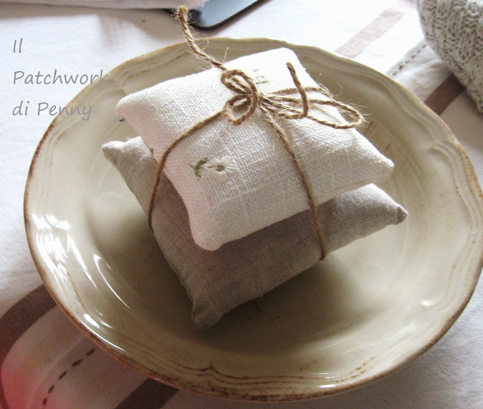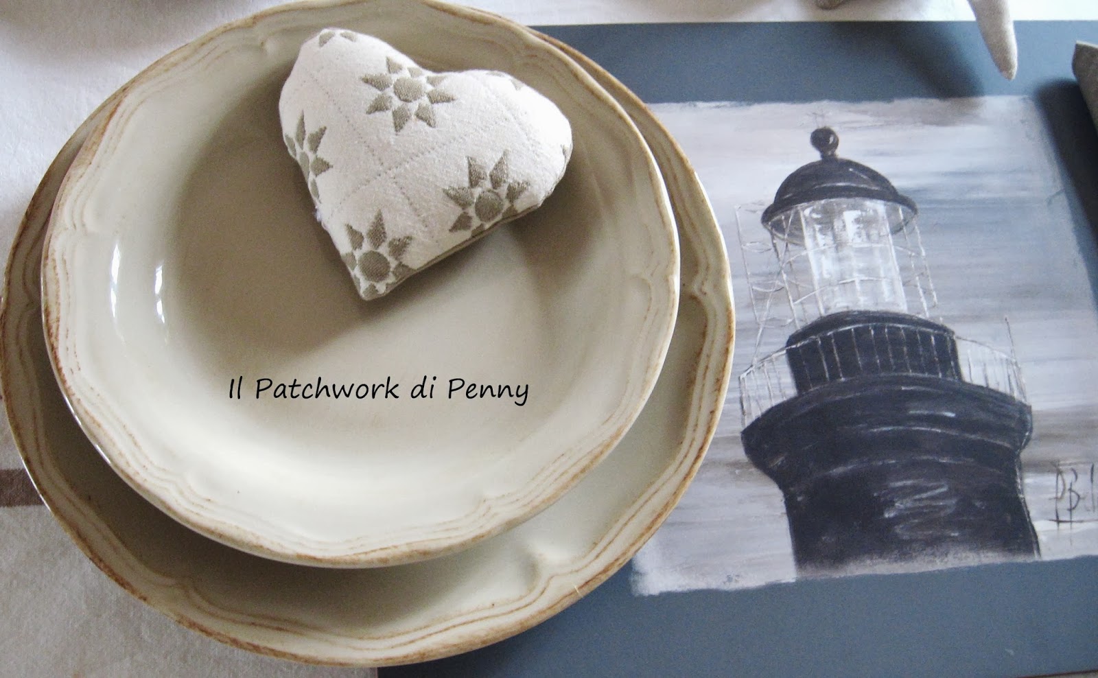 Dal momento che servirò il mio amato pesce, tutto è rigorosamente a tema.Mentre prendevo il set de table, i sottobicchieri autenticamente francesi, che avevo comprato in Bretagna dopo aver sbavato sulla vetrina del negozio per buoni venti minuti, ho pensato bene di aggiungere...una stella marina a pois, due profuma armadi alla vaniglia (spalmo l'imbottitura di qualche goccia di olio essenziale di vaniglia ..ognuno ha le sue perversioni....!..;)) e un cuoricino di lana cucito recuperando un vecchio maglione irlandese.