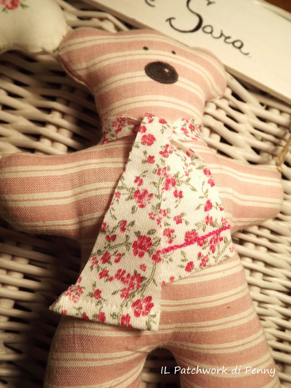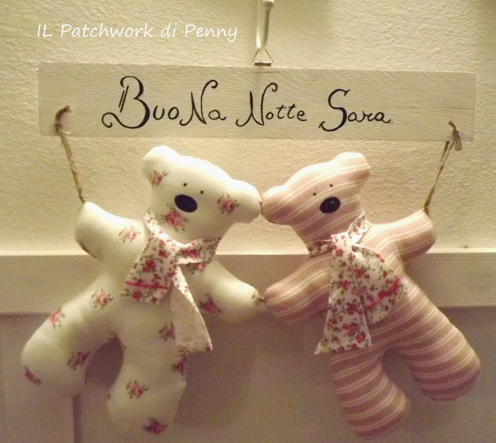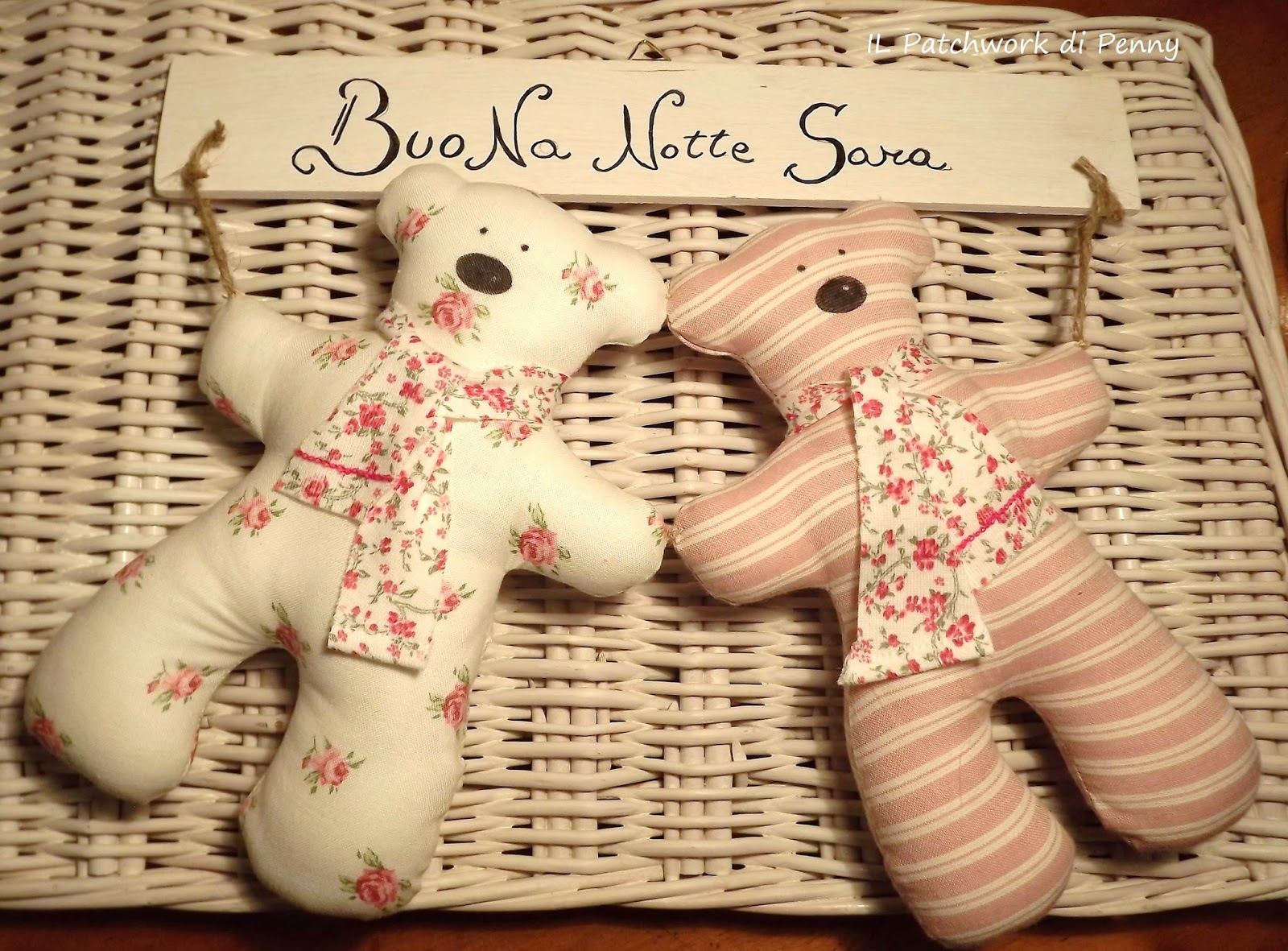 Il tempo non basta mai, ma in queste sere di pioggia e di aria un po' autunnale devo dire di aver riscoperto il piacere di cucire a mano.Imbottire questi due orsetti, rifinirli con ago e filo, disegnar loro il viso e poi dipingere anche un'insegna in legno che auguri la buona notte a una dolce pupetta è stato per me un toccasana.Vorrei recuperare questi piccoli momenti, fatti di movimenti lenti, ripetitivi che allentano ogni tensione mentale e permettono ai pensieri di fluire liberamente.