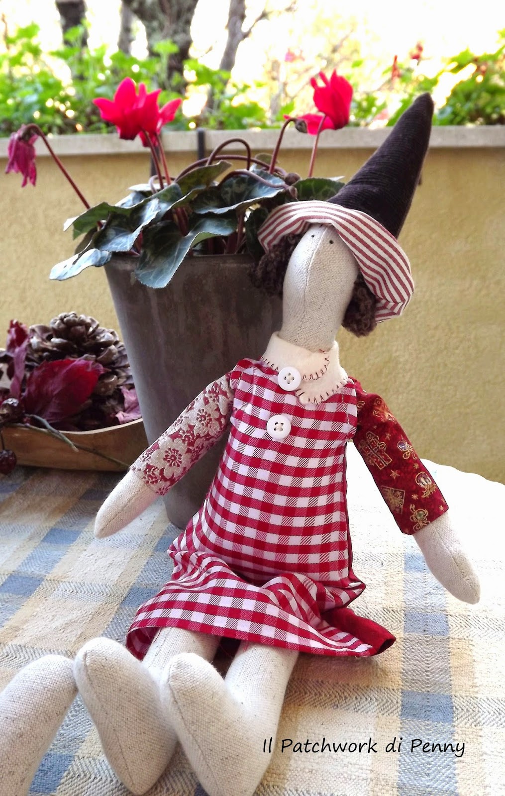 Avete presente il cartamodello Tilda del Babbo Natale/Angelo? Ecco, io ho recuperato quello (infatti non hanno il nasone come vuole la vera Strega di Tilda) e poi ho disegnato il camicione e il cappello un po' ad occhio ( guardando la foto della Strega Tilda da un altro libro...).Insomma un bel mix!;)