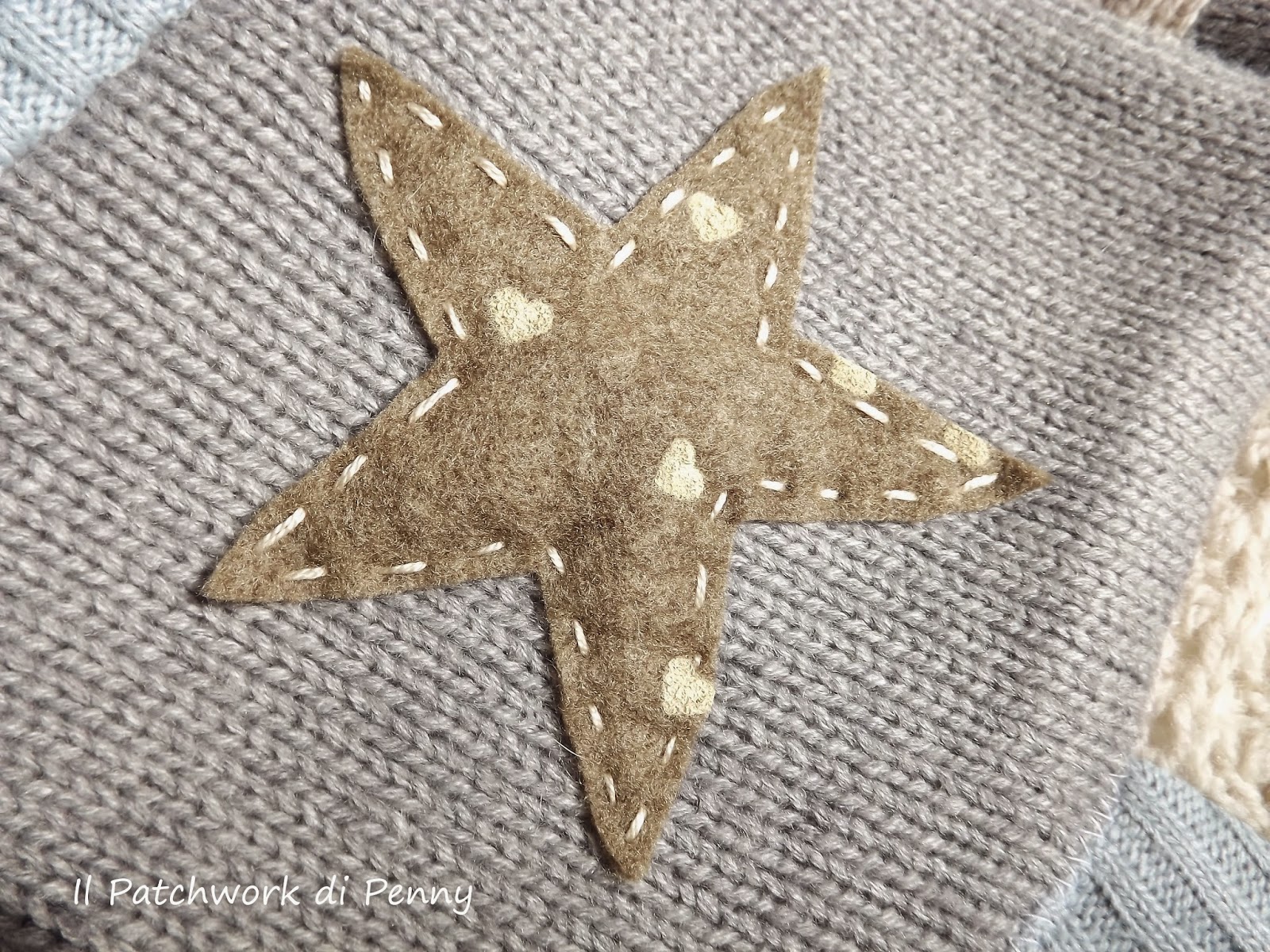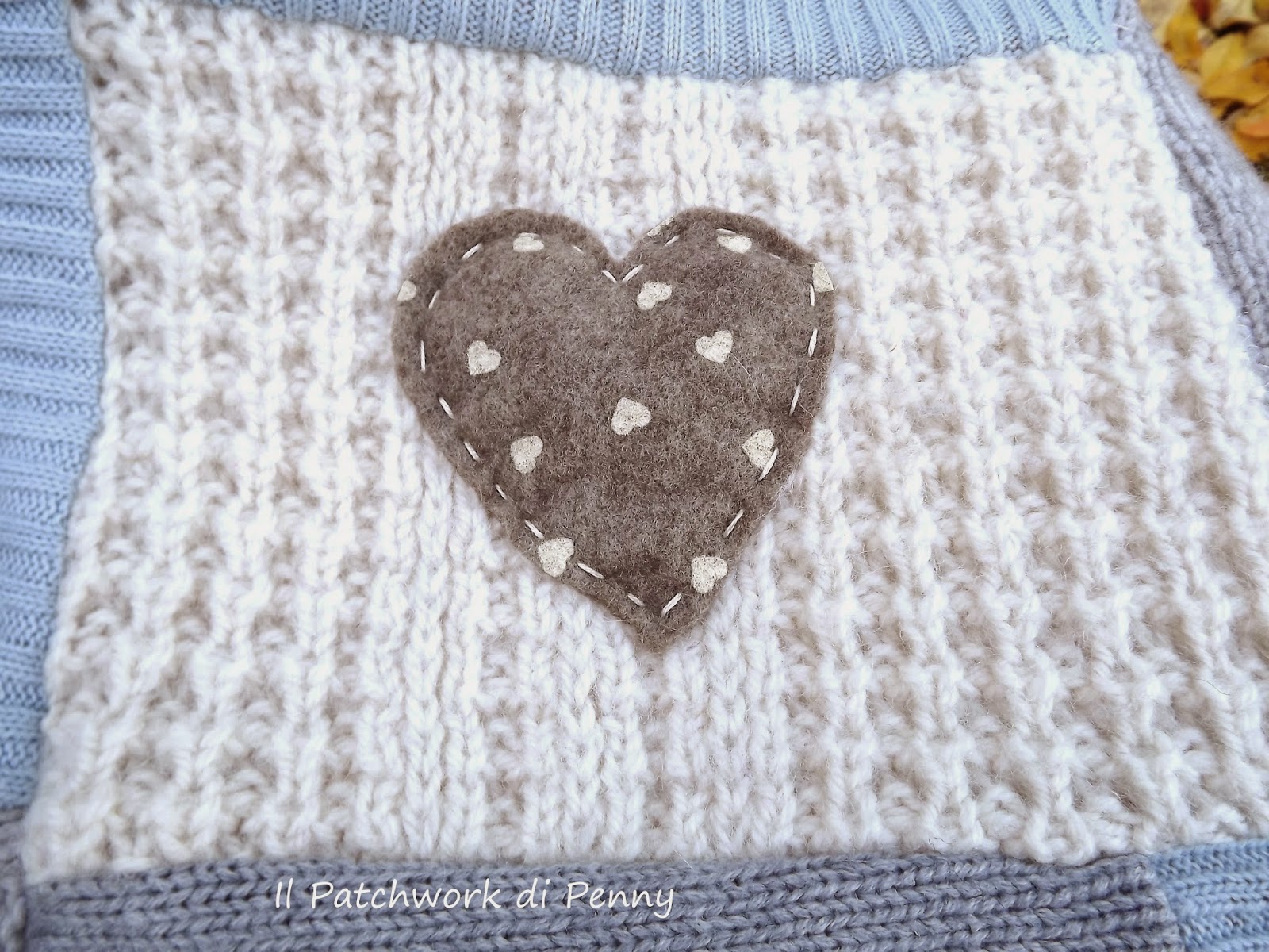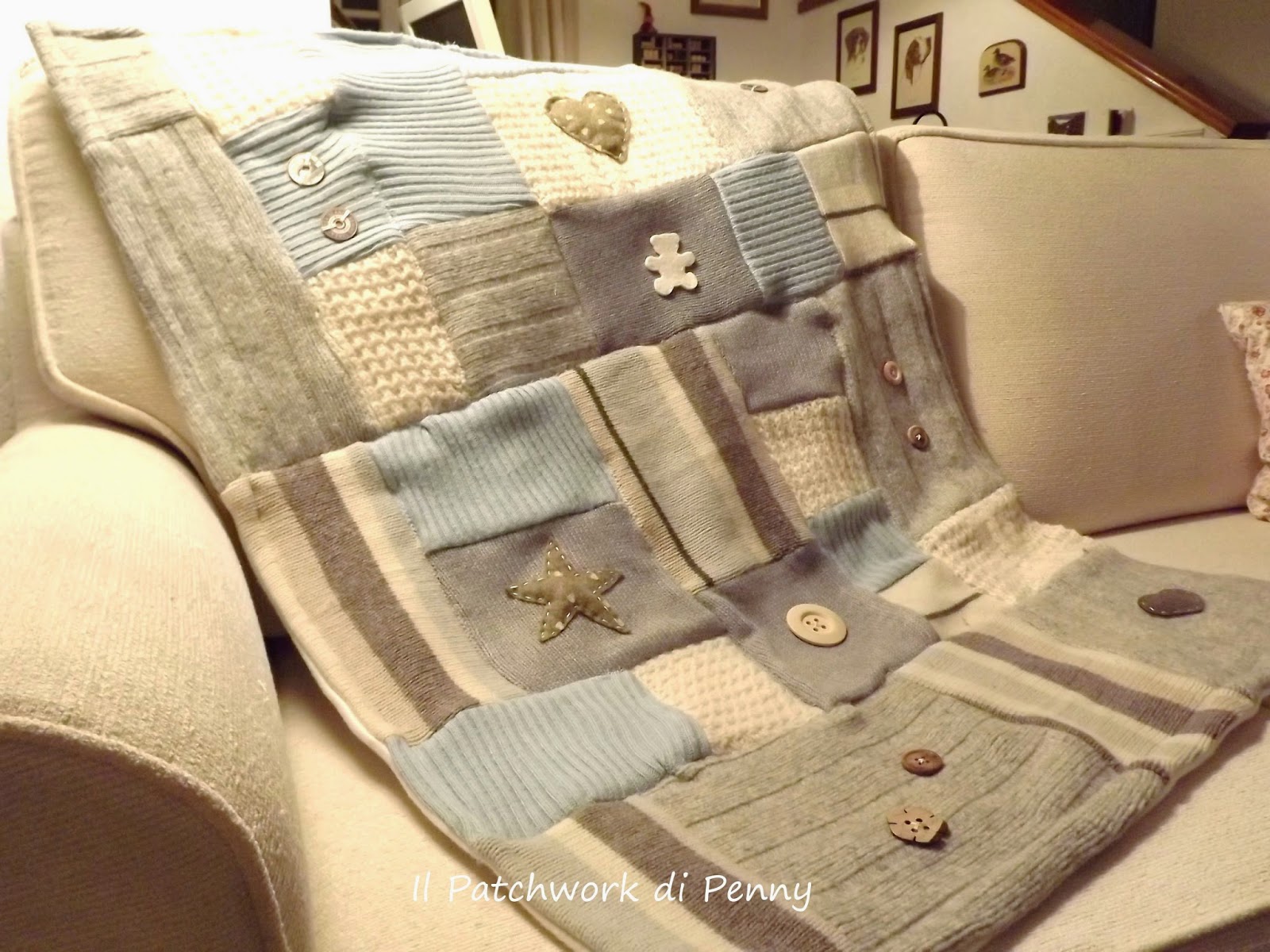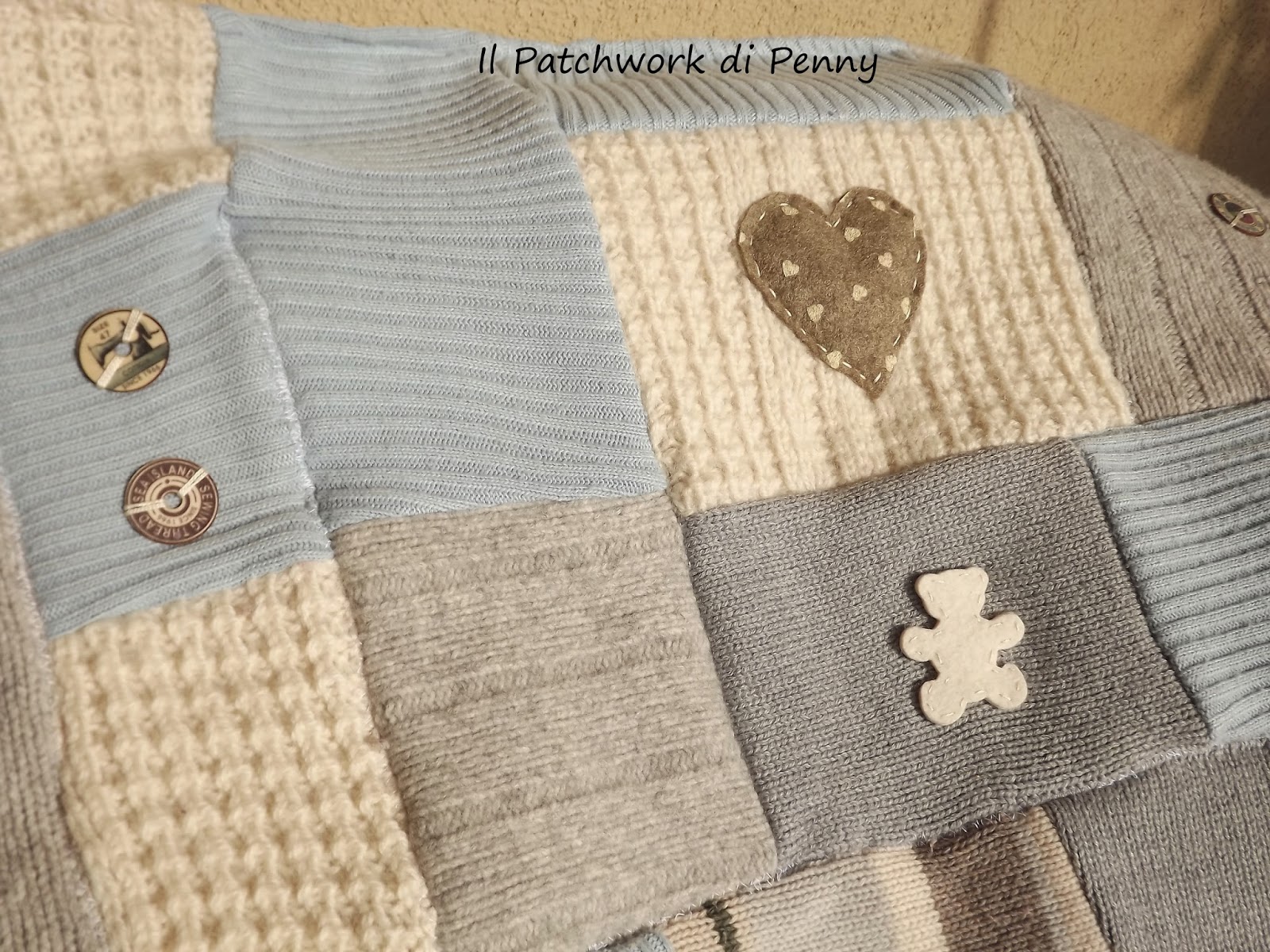 E' nata una sera in cui avevo tirato fuori dall'armadio vecchi maglioni.Erano tutti sui toni del panna, azzurro e grigio..li guardavo e muble muble...mi son detta: ci provo o non ci provo? E così ci ho provato, taglia che ti ritaglia e cuci che ti ricuci dopo qualche ora mi son trovata con un patchwork di lana in mano.Cucir la lana non è stato facile nè per me, nè per la mia macchinina da cucire, ma il risultato è stato sorprendente e io ne sono davvero felice! E voi, che ne pensate?