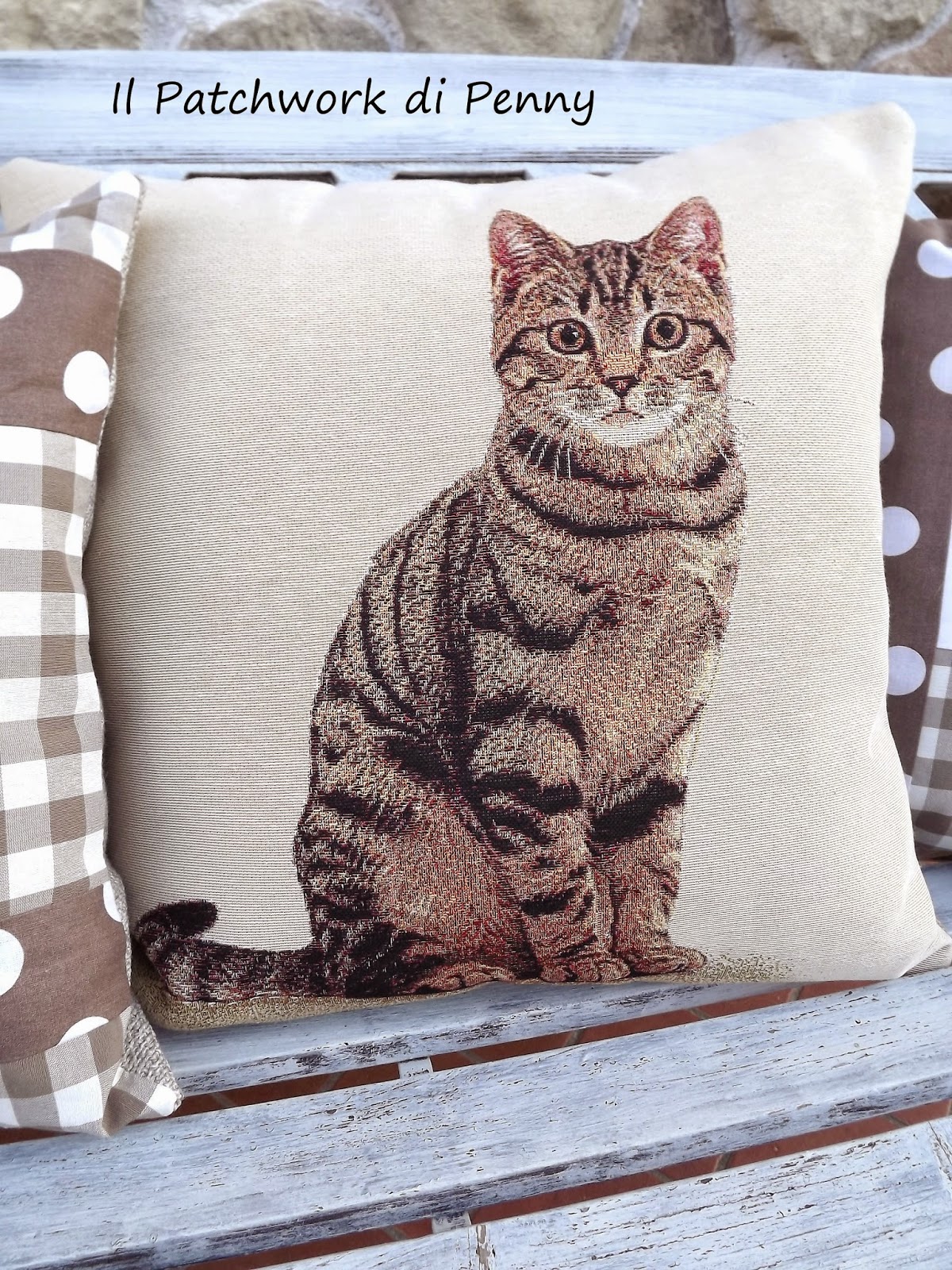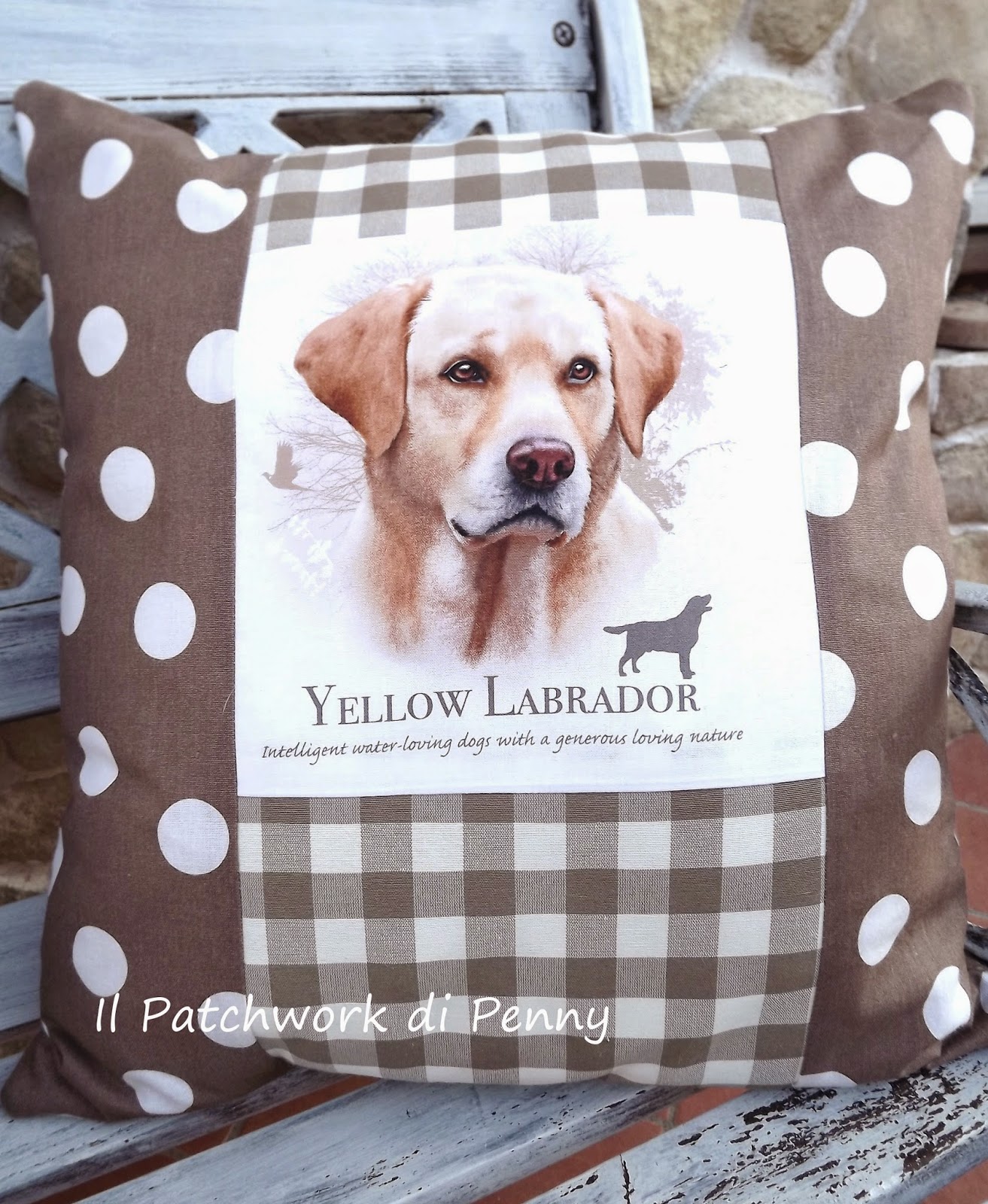 L'occasione è giunta, l'ho abbinata ad una stoffa a quadroni, suo toni del beige.Il risultato mi piace e devo dire che ha avuto davvero successo.A tal proposito, visto il numero di richieste, approfitto per scrivere di seguito tutte le razze disponibili per poter confezionare questi cuscini, anche con altri abbinamenti di stoffe ( per esempio:uno ha il divano rosso e mi dice, ehi, abbinami delle stoffe rosse...chiaro no? ;)).