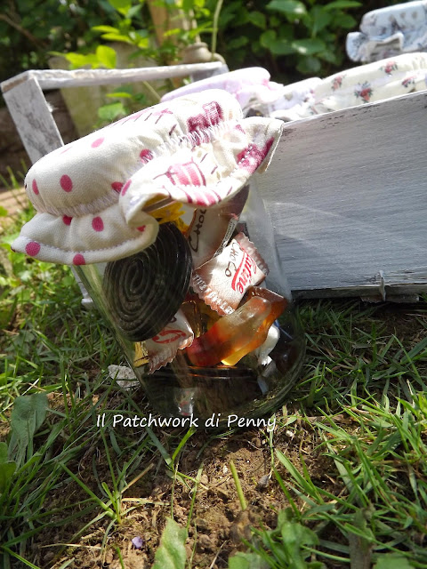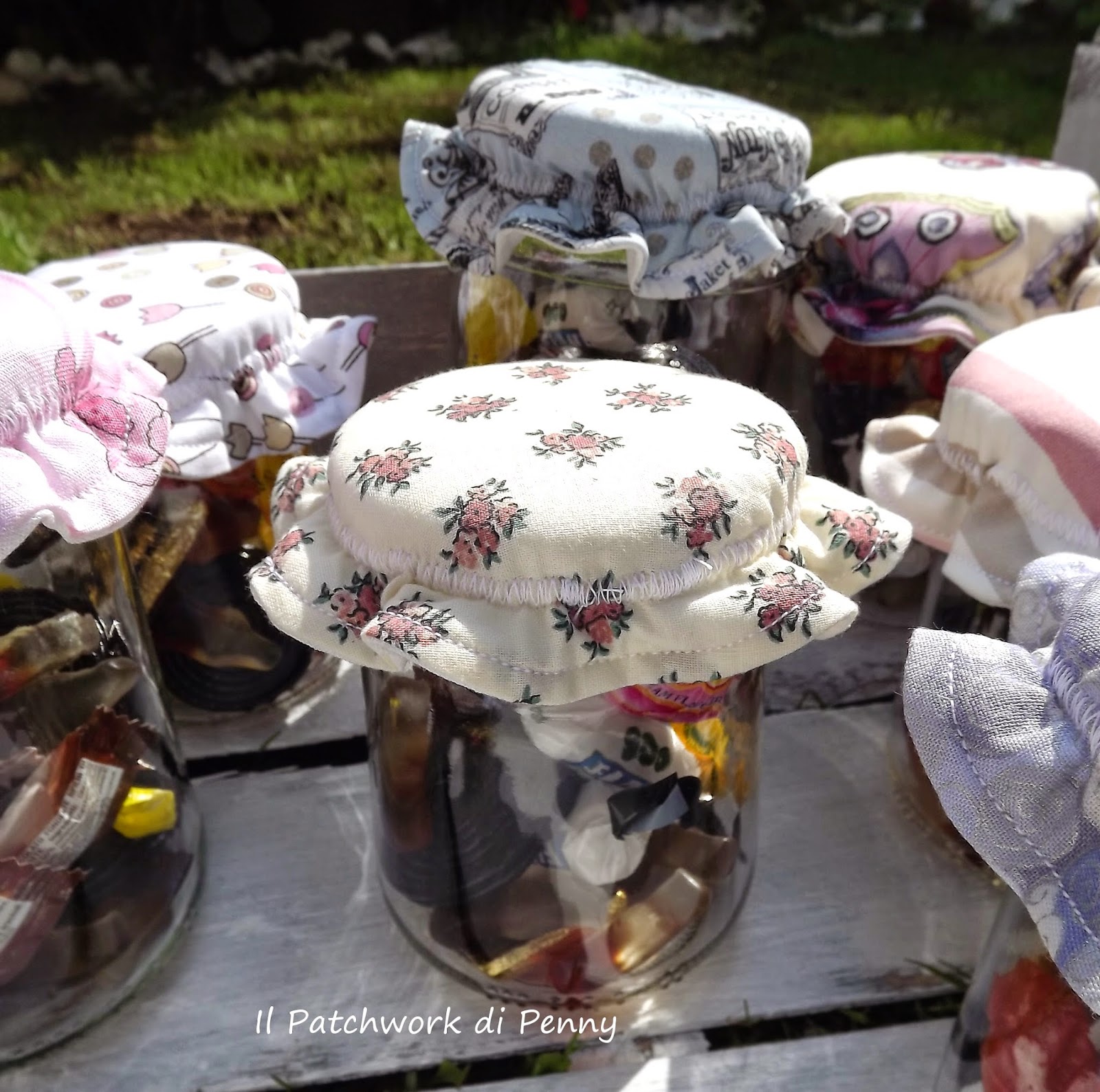 Per fortuna il marito era sull'orlo della beatificazione e in casa vi era molto spazio.Un bel giorno di maggio quando la porta della cambusa non si chiudeva più a causa della quantità di vasetti accumulati, le venne finalmente l'idea che cercava di realizzare da anni.....insomma, non ci voleva molto, ma sono riuscita dopo un paio di tentativi a cucire dei copri coperchi dei vasetti di marmellata!! :) Eureka! Non ho inventato nulla, ho preso spunto da alcune istruzioni che avevo da un giornale, anche se il lavoro che veniva suggerito era molto più certosino e io l'ho semplificato al massimo.Avevo poco tempo e poca pazienza ( MA VA?) e tanti scampoli di stoffa che mi guardavano languidamente....e così ho preso un paio di misure, scovato un simpatico elastico sottile e ho cucito, cucito e cucito.Cosa vi mostrerò mai e come avrò riutilizzato questi vasetti? Ho scelto di riempirli di dolcetti e di regalarli ai bimbi invitati alla festicciola di mia figlia.Un pensiero "dolce" e un invito a riciclare il vasetto magari in qualche cucina, per del the, o delle spezie, per la cannella o la lavanda..insomma largo alla fantasia, no? ;) Spero vi piacciano, per me sono carini anche come bomboniere, anche se andrebbero perfezionati....immaginateveli con delle stoffe ninine sul rosa o sull'azzurro....con uno spago e un'etichetta country..mmm..mumble mumble....mi sa che mi cimenterò in altri esperimenti!