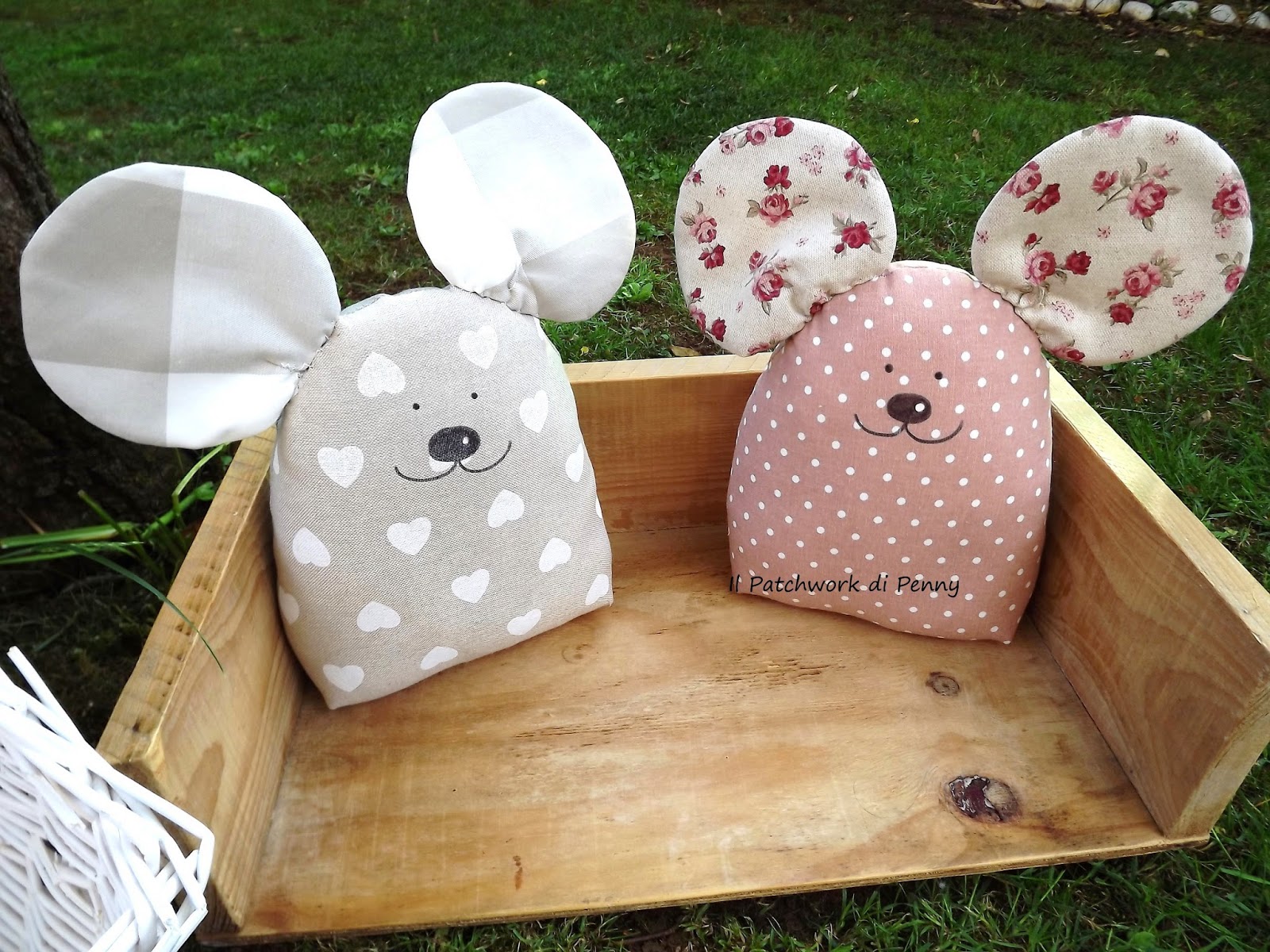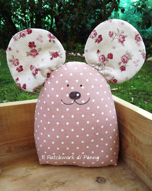 Dovete sapere che tanto tanto tempo fa mi sono ritrovata a fissare incantata un calzino di mia figlia...ora....cosa era ricamato su quel calzino? Un topino davvero buffo che mi è entrato subito nel cuoricino.Illuminazione! E se lo facessi di stoffa? E così, carta, matita, gomma...santa pazienza e il giorno di Pasqua- mentre digerivo il pranzo- è uscito il cartamodello.E' un fermaporta, esattamente come i gattoni disegnati anni fa (per quelli non mi ero ispirata a dei calzini però...;)..) che ormai cucio di tutti i colori e addobbo con vari gingilli scovati ai mercatini dell'usato...