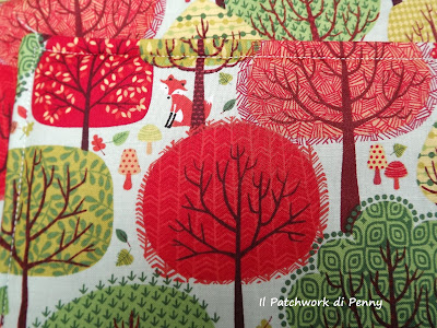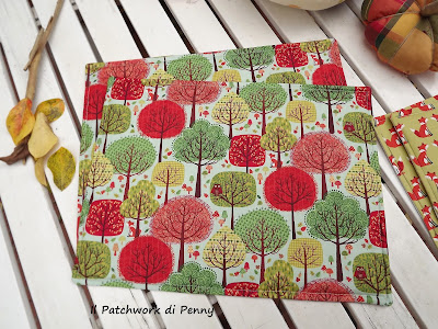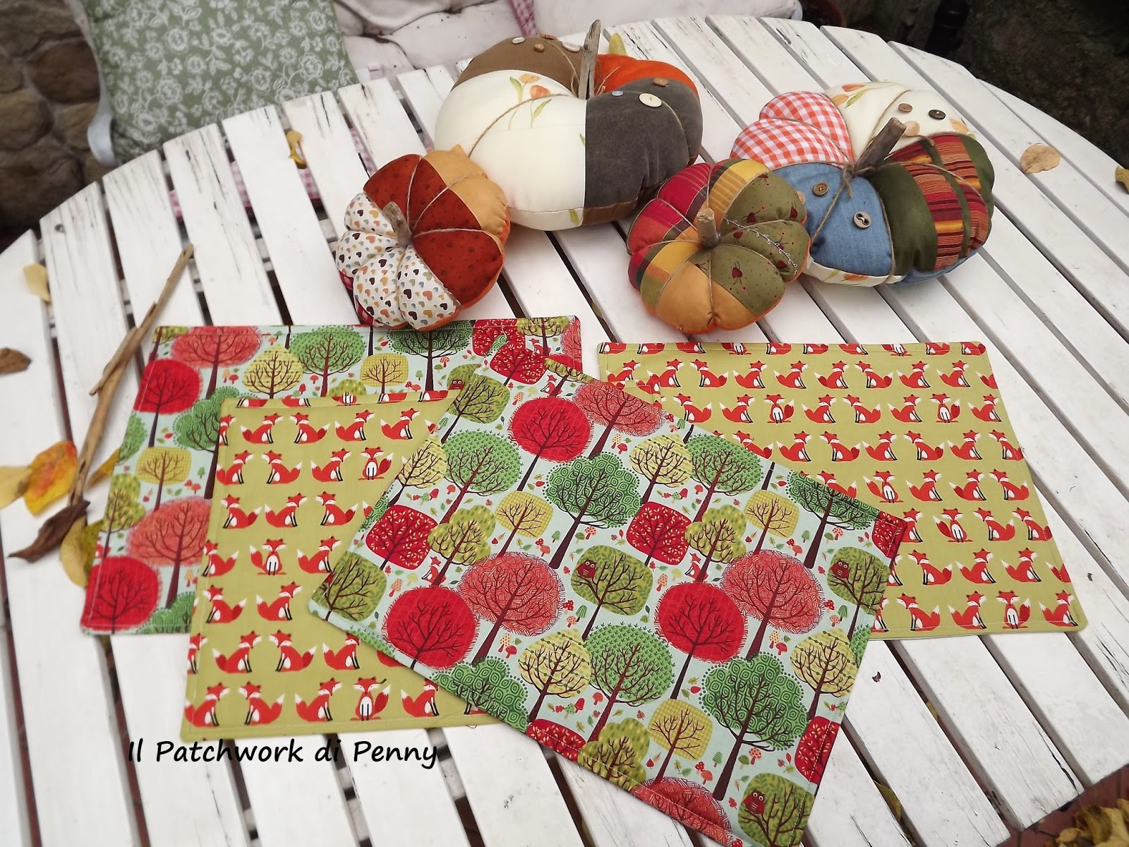 Erano degli scampoli/scampoloni perchè la misura era perfetta per farne delle tovagliette all'americana.Sapete che le adoro e che in casa usiamo solo quelle per la colazione, un pranzo veloce oppure lo spuntino di mezzanotte (per la cena restiamo sulla classica tovaglia....;)..) Quindi sono nate queste due coppie dai colori accesi, verdi, arancione e rosso come le foglie che stanno riempiendoci l'erba del giardino, con gli animaletti che occhieggiano tra i rami, gli amati gufetti e le volpi con la loro coda morbidissima.Le tovagliette sono tutte imbottite in modo da non rovinare la superficie del tavolo ( legno o cristallo) dove vengono appoggiate.Si potrebbero fare anche senza, ma sapete che per me spesso praticità fa rima con creatività! :)