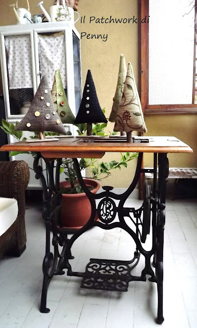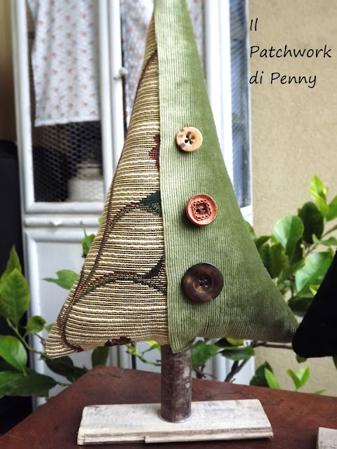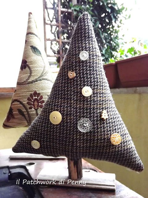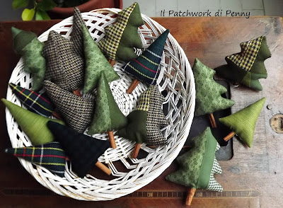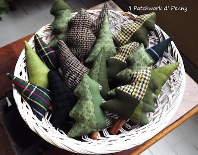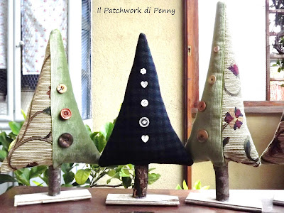 Accanto agli alberelli, altri di dimensioni più piccole ( cui dovrò aggiungere il nastro per appenderli, ora non ho ancora avuto tempo, ma immaginateveli completi) tutti cuciti con delle stoffine di cotone americano e scampoli assemblati come sempre in modo patchworkoso :) Il loro tronco è una stecca di cannella...mmm che profumini.Non vi vien voglia di bervi un bel brulè caldo? ;)