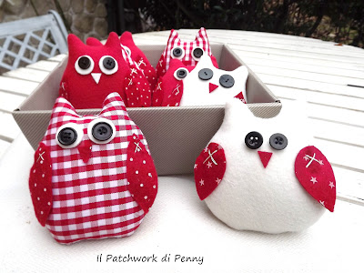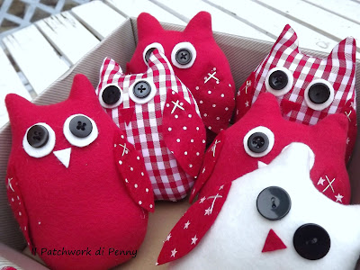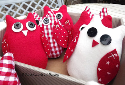 In questo ultime settimane mi sono decisamente staccata da ago e filo (non troppo comunque!) e ora, prima di mostrarvi le realizzazioni delle ultime idee ( ho pensato molto... :)) pubblico le foto della mia ultima fatica dicembrina.Sì, i colori sono piuttosto natalizi,perchè la commissione è arrivata proprio al fine di addobbare il tavolo della Vigilia.Provate comunque a dare sfogo a tutta la fantasia che avete e pensate a questi gufetti con tinte completamente diverse.Io li ho già in mente:più primaverili, sui toni pastello, per un bel pranzetto domenicale o pasquale, oppure più moderni su tinte nere e bianche per giocare sui contrasti e rendere comunque "ninina" una tavola non necessariamente shabby chic..Mi piace poi proporli tutti assieme, in un bel cestino, con un bel fiocco....e chiaramente, come i servizi che si rispettino, proporli a serie di sei. MMMM, mi sono quasi convinta, chissà che non li metta a breve in produzione....!