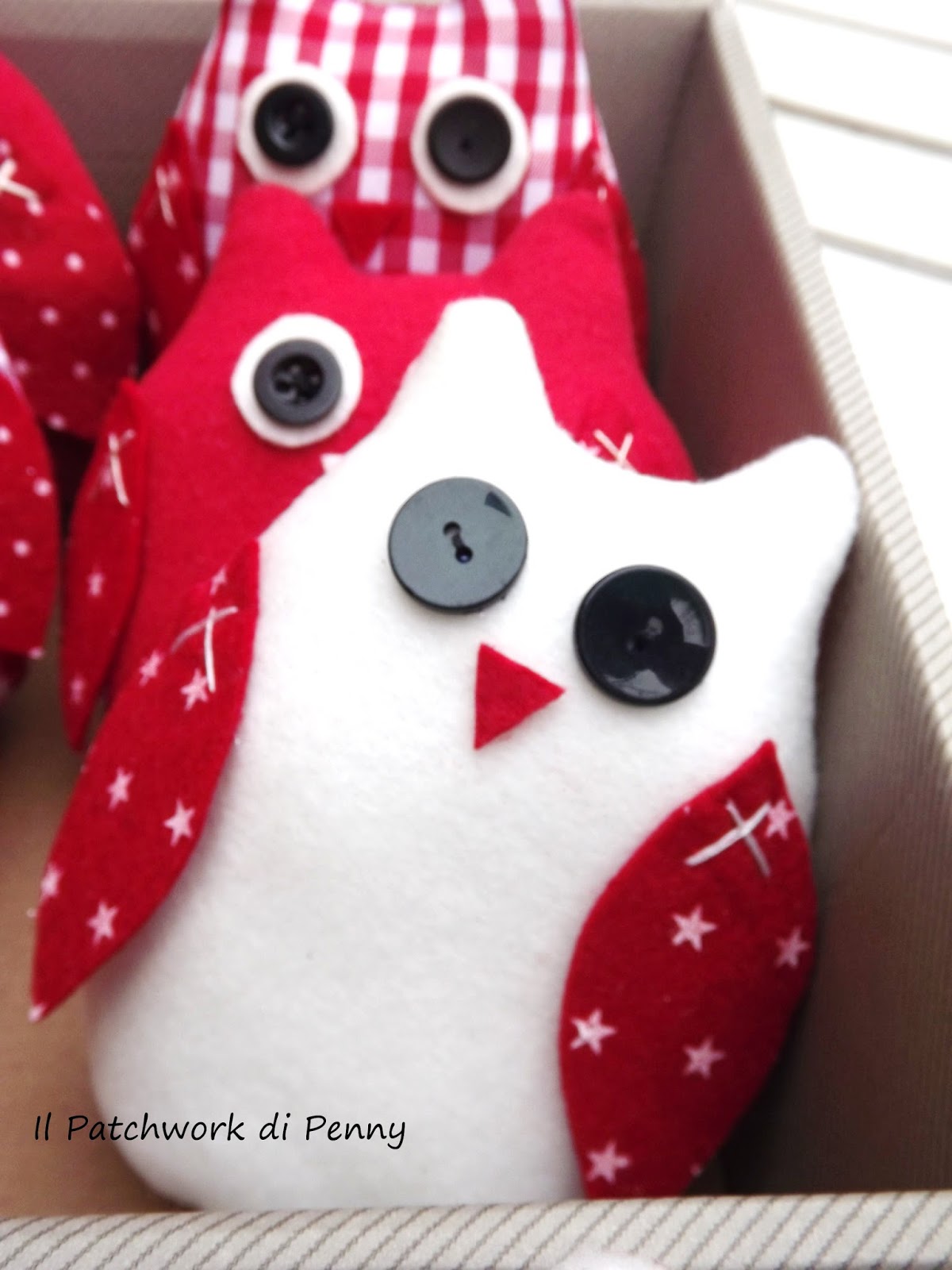In questo ultime settimane mi sono decisamente staccata da ago e filo (non troppo comunque!) e ora, prima di mostrarvi le realizzazioni delle ultime idee ( ho pensato molto... :)) pubblico le foto della mia ultima fatica dicembrina.Sì, i colori sono piuttosto natalizi,perchè la commissione è arrivata proprio al fine di addobbare il tavolo della Vigilia.Provate comunque a dare sfogo a tutta la fantasia che avete e pensate a questi gufetti con tinte completamente diverse.Io li ho già in mente:più primaverili, sui toni pastello, per un bel pranzetto domenicale o pasquale, oppure più moderni su tinte nere e bianche per giocare sui contrasti e rendere comunque "ninina" una tavola non necessariamente shabby chic..Mi piace poi proporli tutti assieme, in un bel cestino, con un bel fiocco....e chiaramente, come i servizi che si rispettino, proporli a serie di sei. MMMM, mi sono quasi convinta, chissà che non li metta a breve in produzione....!
