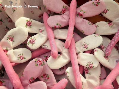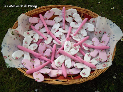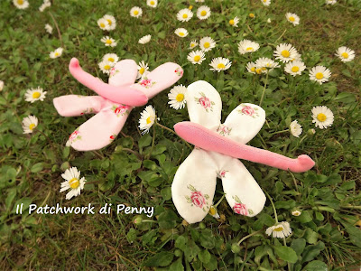 Si tratta di una ventina di libellule preparate per una dolcissima bambolina che riceverà il battesimo a fine mese.D'accordo con la mamma, ho preparato le dragonflies di stoffa che poi lei ha completato fissandole su delle bomboniere a forma di fiore.Indivinate il colore? ;) Rosa ovviamente, e di tutte le tonalità, più intenso per il corpo, in tinta più tenue per le roselline su sfondo bianco- oppure rosa-, delicatissimo sul tulle portaconfetti.