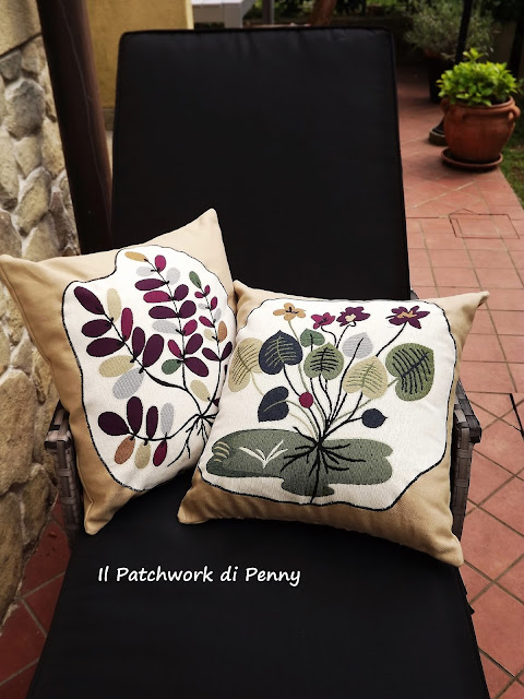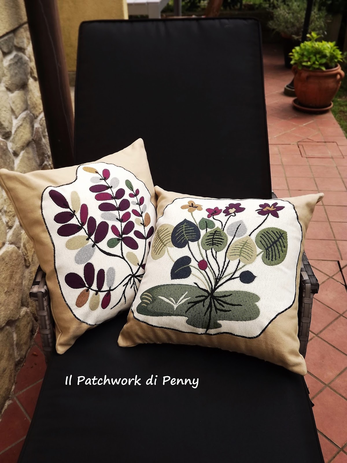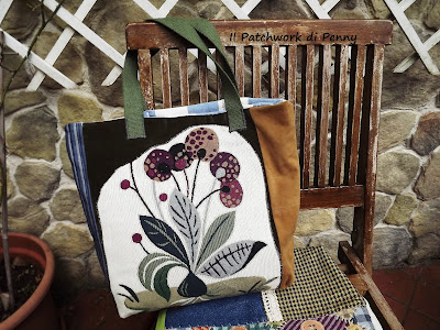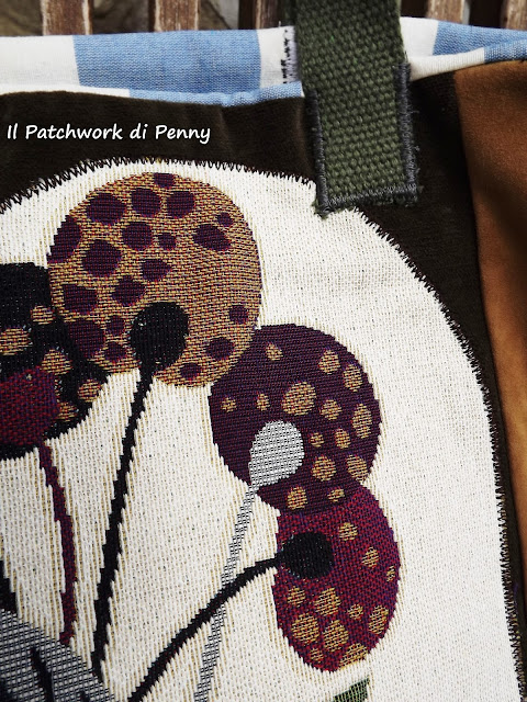 Era piena di fiori.Io li ho ritagliati e poi applicati prima su dei cuscini, poi su delle borsette che aveto già patchworkosamente cucito recuperando ed assemblando stoffa jeans e vecchi rimasugli di tessuti più pesanti.E ditemi: non le trovate primaverili? :)