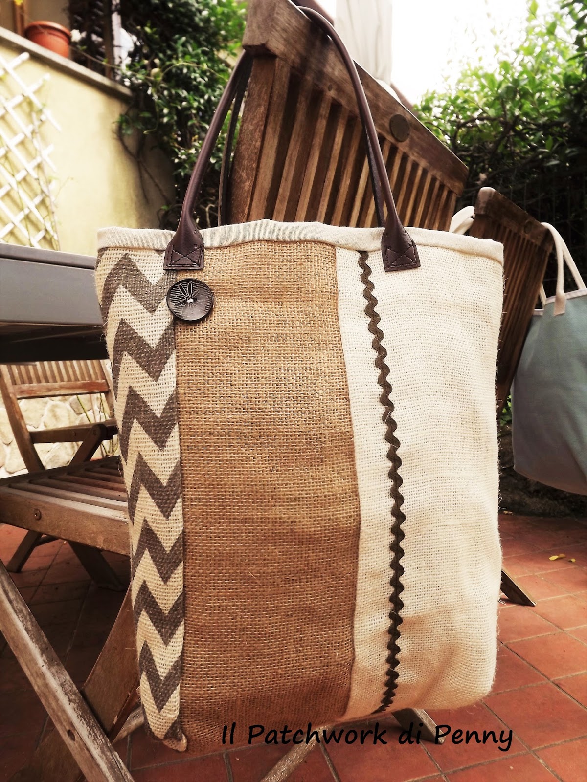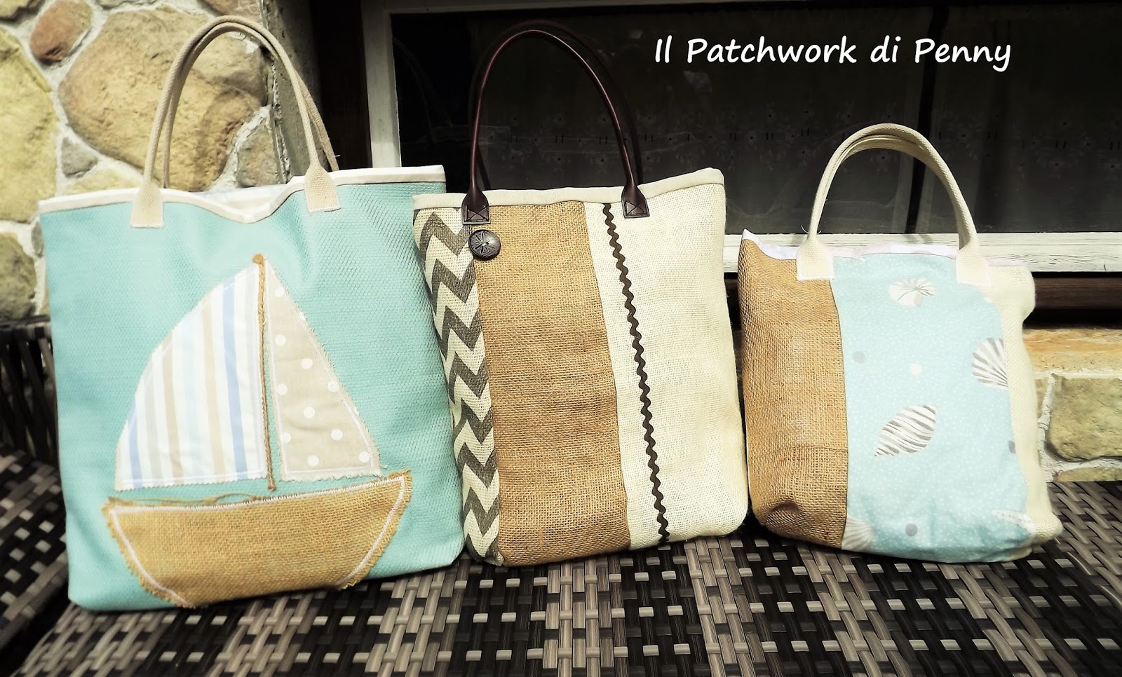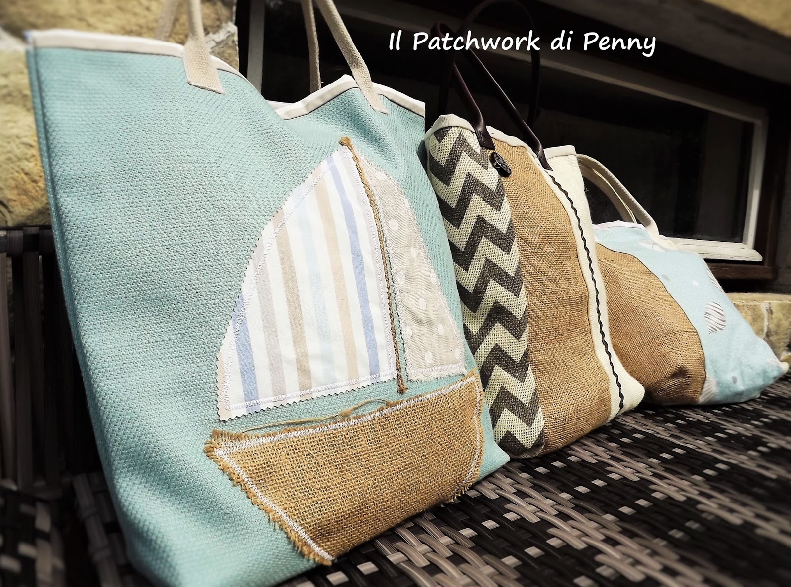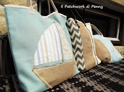 Oltre al cotone 100%, ho usato la iuta di varie tonalità e sfumature e manici di similpelle.Li ho accostati a delle stoffe che ho comprato in Cornovaglia ( che sogno!) delicatissime, con decorazioni marine che non riescono mai a stufarmi.