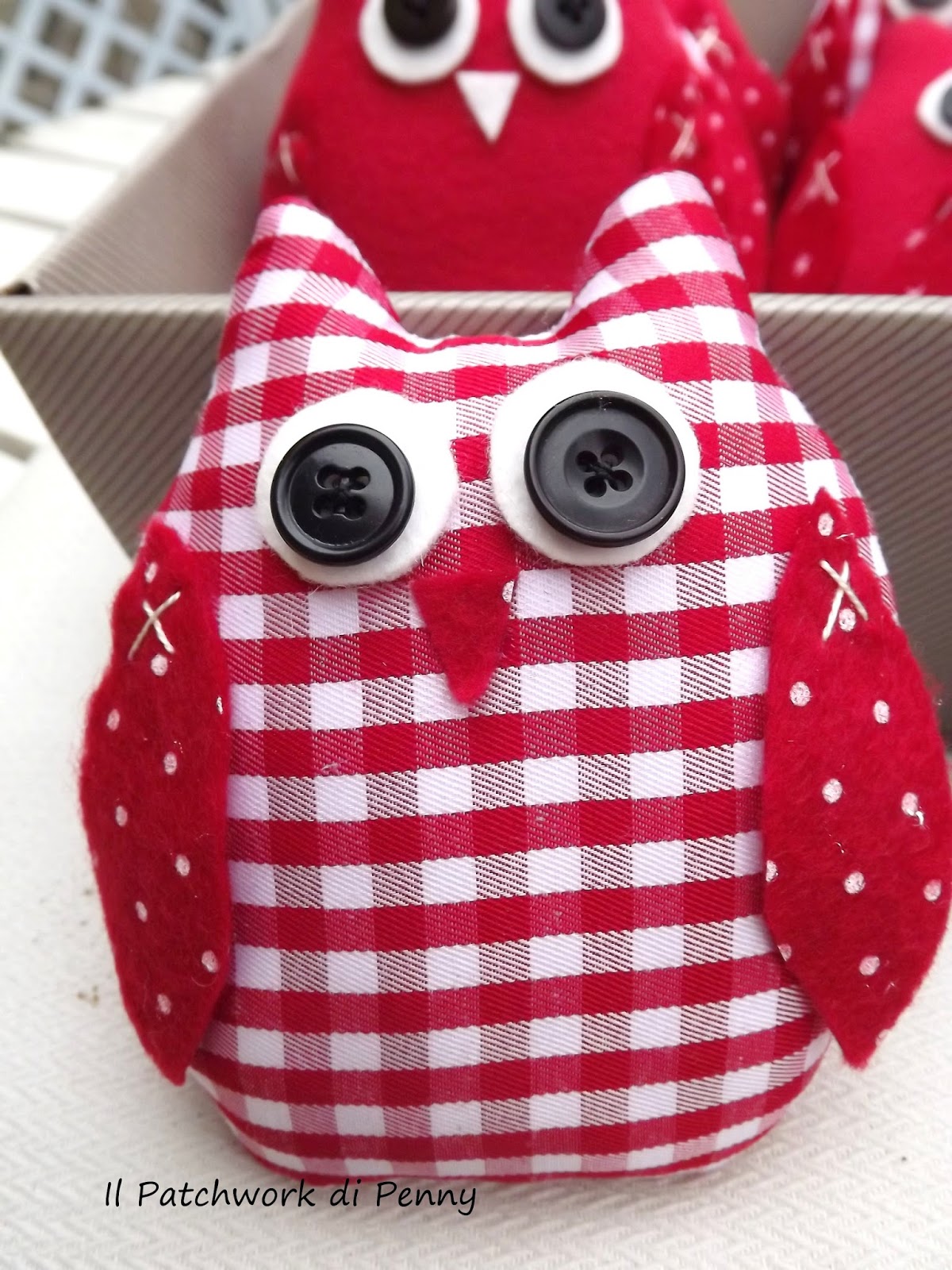 In questo ultime settimane mi sono decisamente staccata da ago e filo (non troppo comunque!) e ora, prima di mostrarvi le realizzazioni delle ultime idee ( ho pensato molto... :)) pubblico le foto della mia ultima fatica dicembrina.Sì, i colori sono piuttosto natalizi,perchè la commissione è arrivata proprio al fine di addobbare il tavolo della Vigilia.Provate comunque a dare sfogo a tutta la fantasia che avete e pensate a questi gufetti con tinte completamente diverse.Io li ho già in mente:più primaverili, sui toni pastello, per un bel pranzetto domenicale o pasquale, oppure più moderni su tinte nere e bianche per giocare sui contrasti e rendere comunque "ninina" una tavola non necessariamente shabby chic..Mi piace poi proporli tutti assieme, in un bel cestino, con un bel fiocco....e chiaramente, come i servizi che si rispettino, proporli a serie di sei. MMMM, mi sono quasi convinta, chissà che non li metta a breve in produzione....!